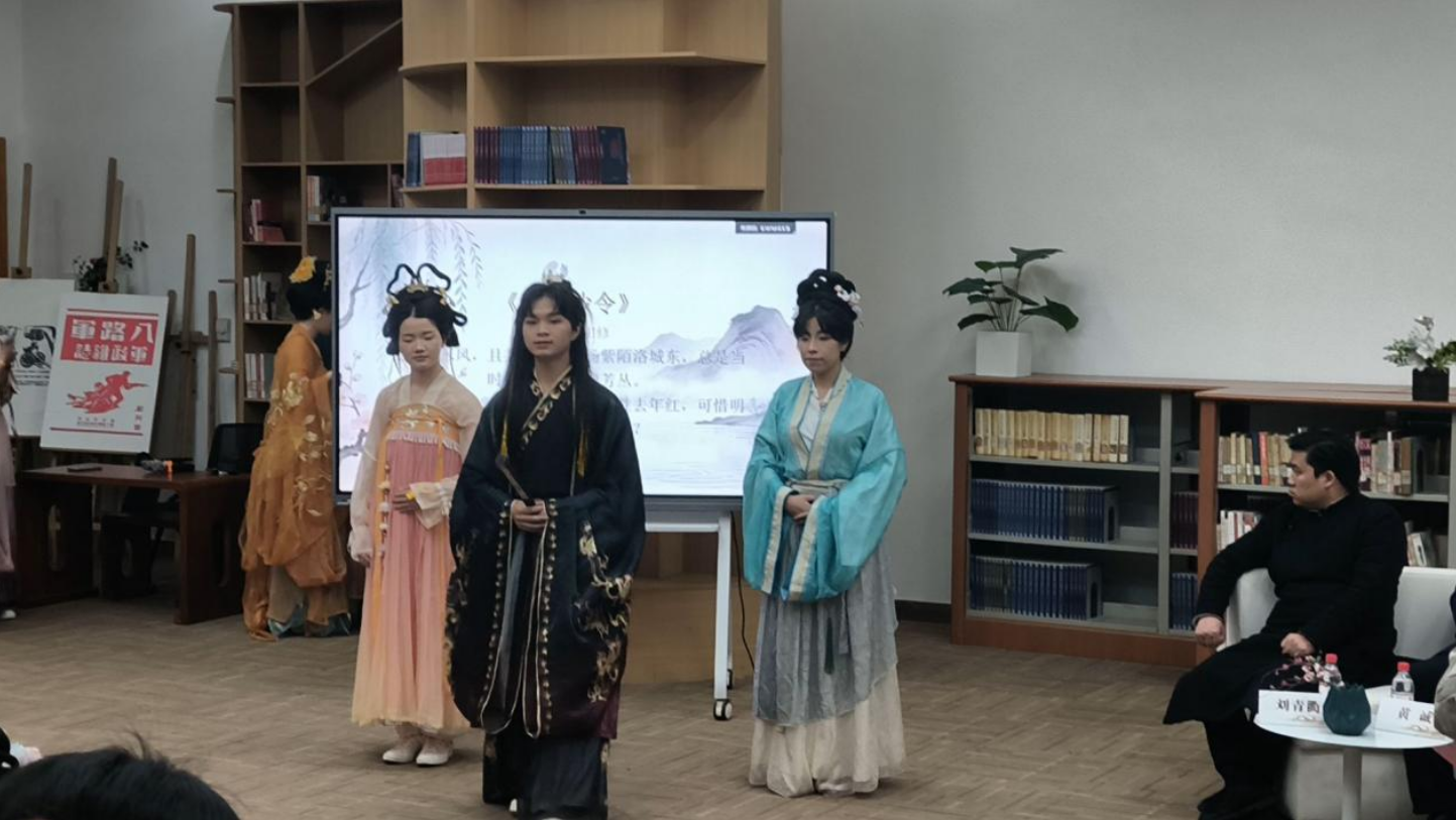 随后的“春韵诗诵・经典传承”环节中,十几位身着汉服的同学闪亮登场,他们以朗读与吟唱相结合的方式,依次演绎和展示了《如梦令》《春晓》《春夜喜雨》《忆江南》和《浪淘沙令》等经典春日诗词。活动还邀请到了由贵州大学图书馆选送并在贵州省第三届全民诗词大赛大学生组一等奖获得者许嘉霖、成人组二等奖获得者罗李源同学进行特别分享和展示。罗李源同学现场朗诵了其原创诗词作品《临江仙·春》,把家国情怀、青春感悟以及对诗词由衷的热爱都写进了诗句中。