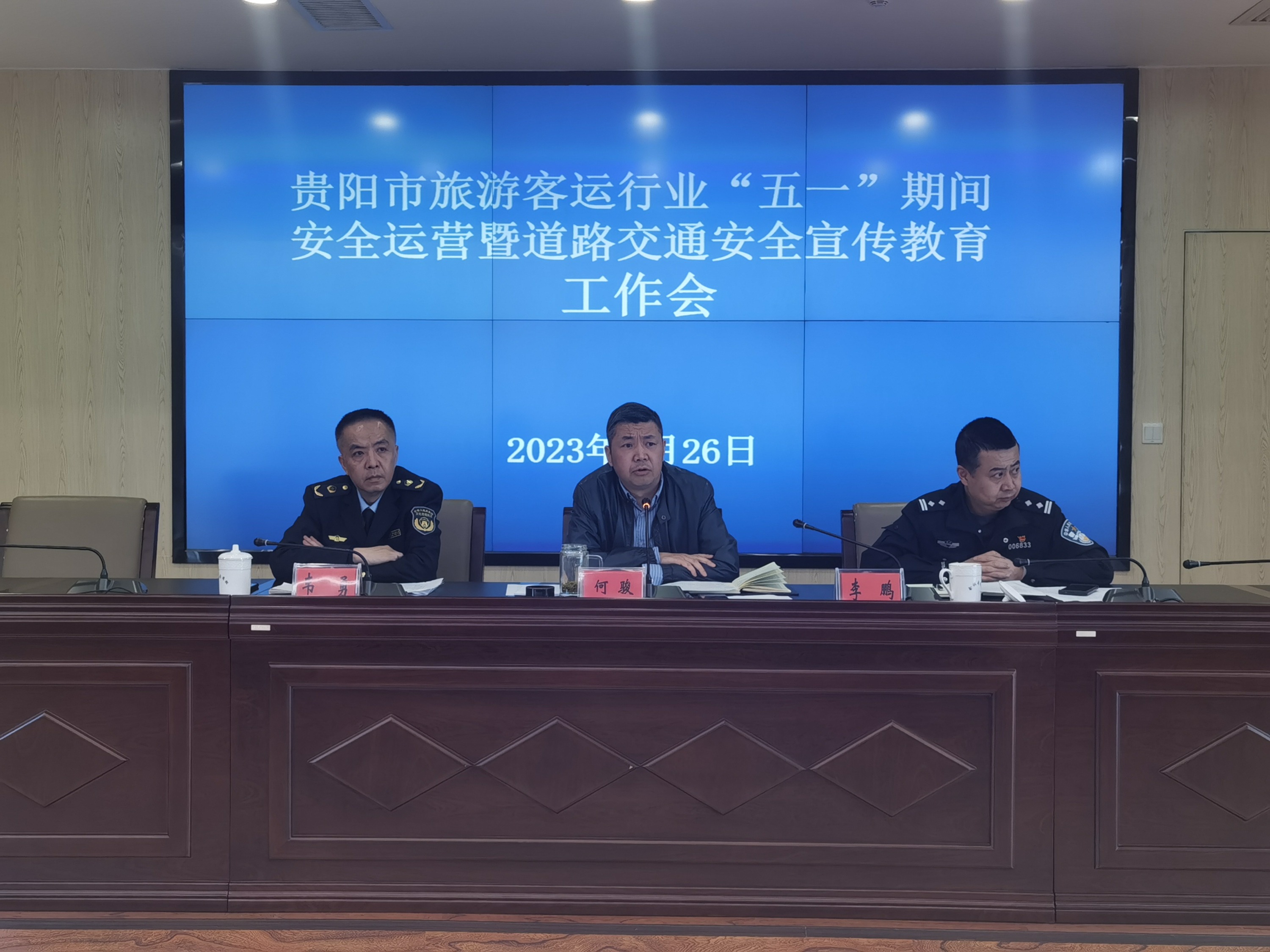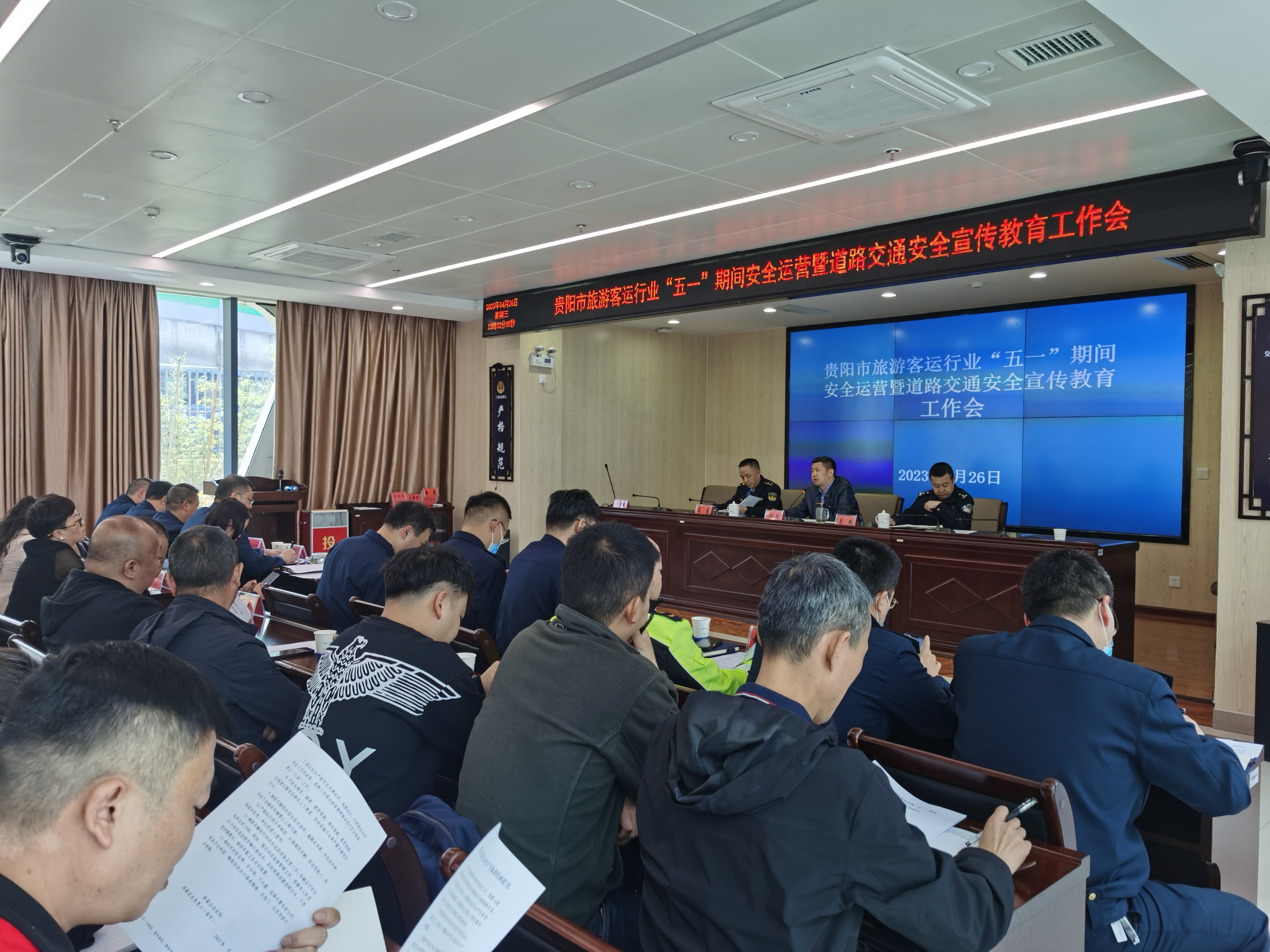 2023年4月26日,贵阳市交通委员会会同市公安交管、市文旅执法支队组织全市54家旅游客运企业,召开“五一”期间安全运营暨道路交通安全宣传教育工作会。会议由市交委党委委员、市交通执法支队支队长何骏主持。