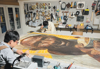 二〇二二年底,工作人员正在观察油画《父亲》并准备进行修复。寇旭乾摄