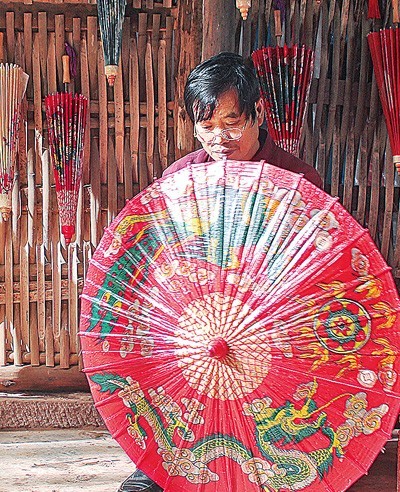 在做好传统伞艺传承的同时,毕六福还在努力挖掘油纸伞背后的文化底蕴。“龙凤呈祥”是一幅具有200多年历史的伞面图案,讲述的是春秋时期秦穆公之女弄玉和萧史的爱情故事。为了达到复古如古的效果,毕六福用回了传统的石版印刷工艺,如今,“龙凤呈祥”系列产品已经成为他的油纸伞店的爆款,有顾客评价,“老图样竟也可以这么美。”