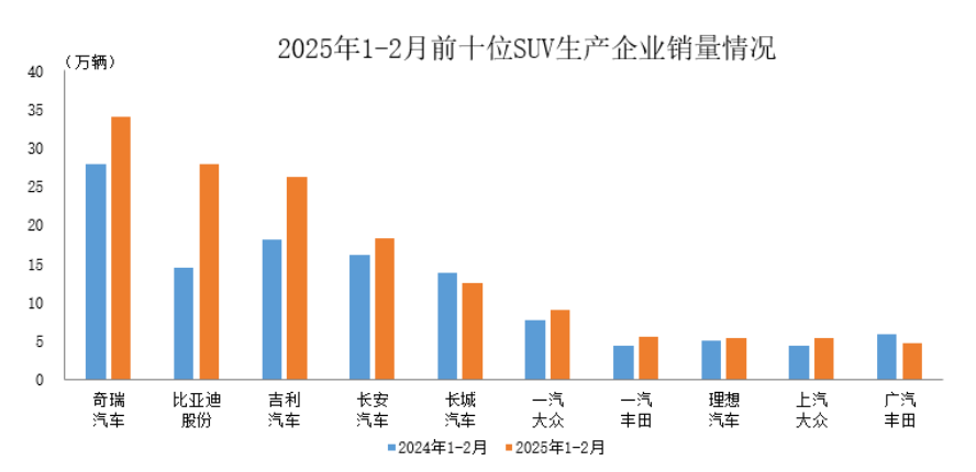 据中国汽车工业协会统计分析,2025年1-2月,销量排名前十位的SUV生产企业共销售149.1万辆,占SUV销售总量的71.2%。