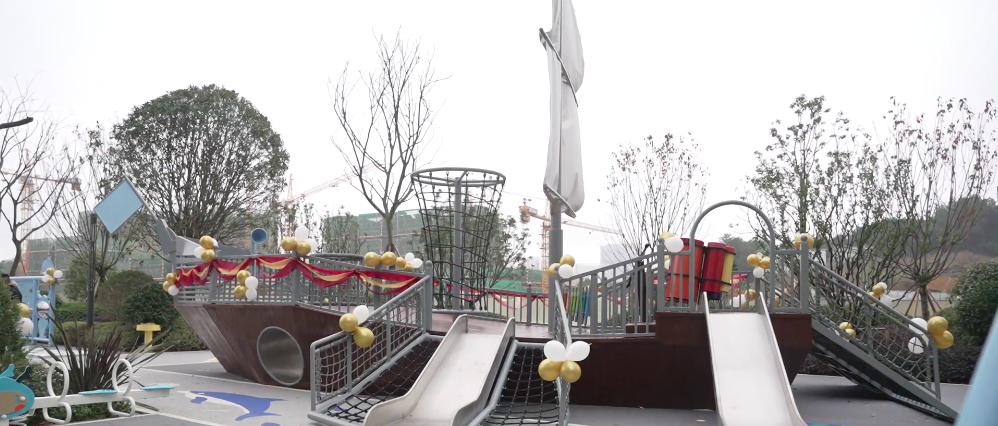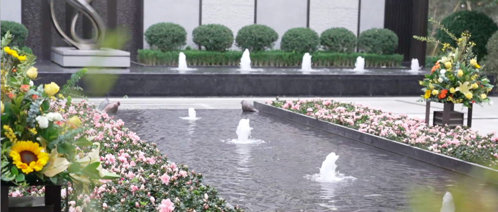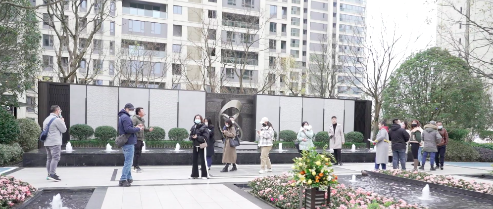 乘电梯进入小区,媒体团在绿树繁花和镜面水景的掩映中前行,道路两侧与中轴的跳动涌泉列阵式排开,颇有设计感。往里走,干净整洁的地面、色彩鲜明的跑道观感舒适,层层园林景观也获得媒体团好评。