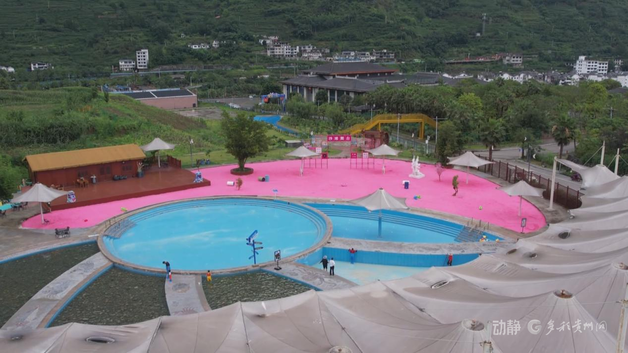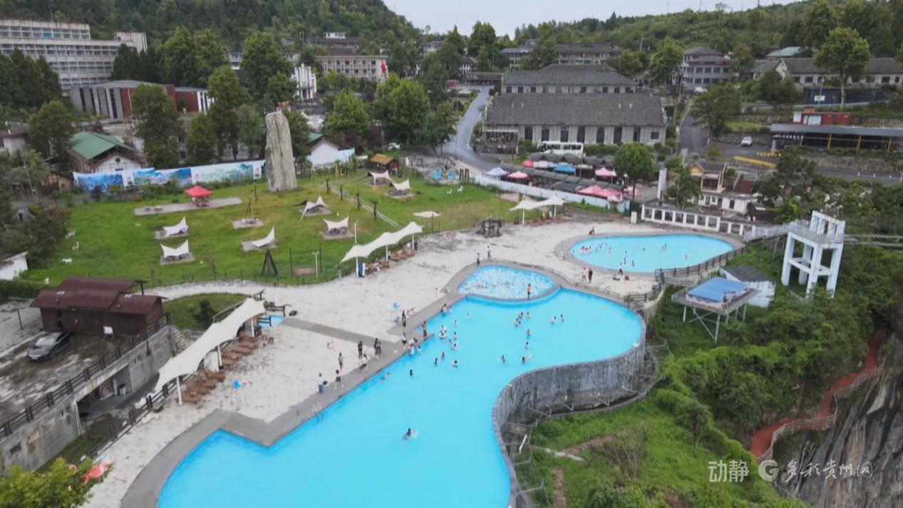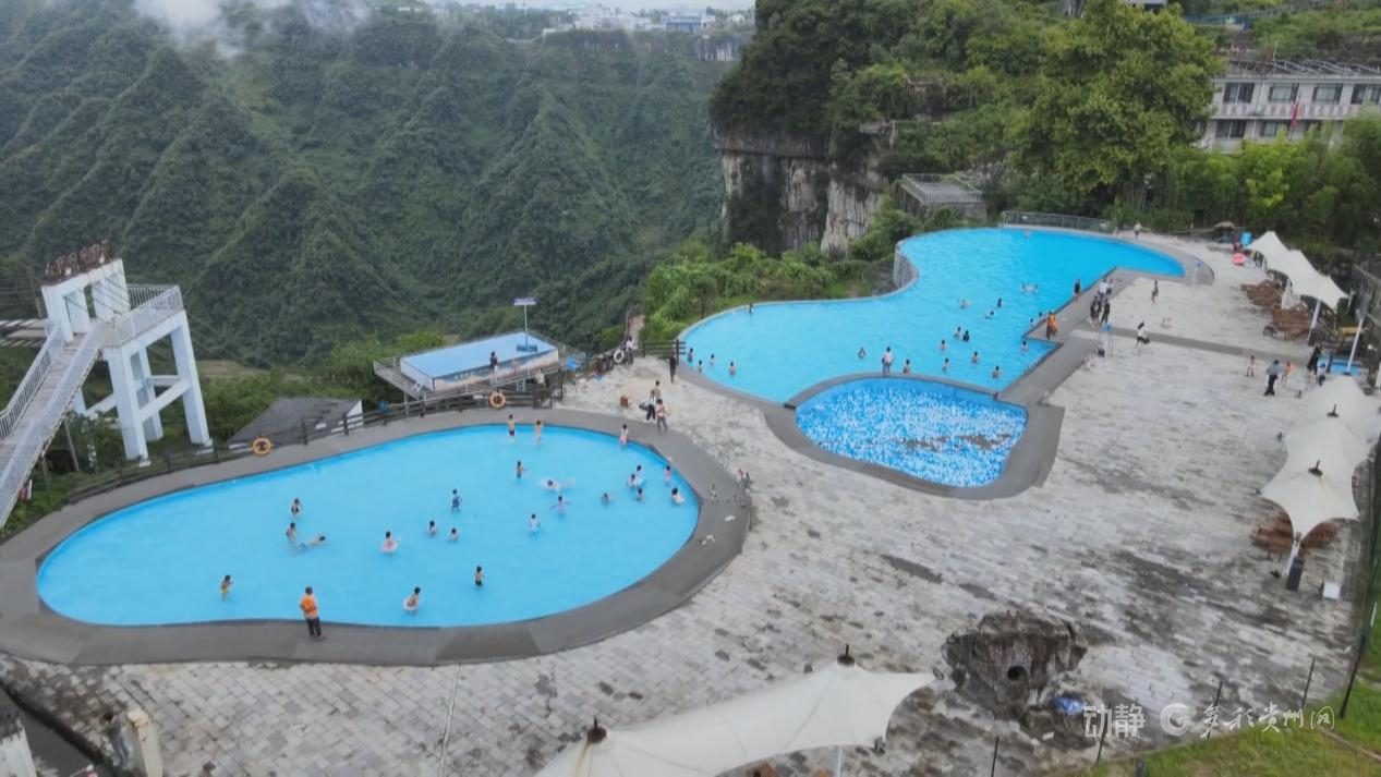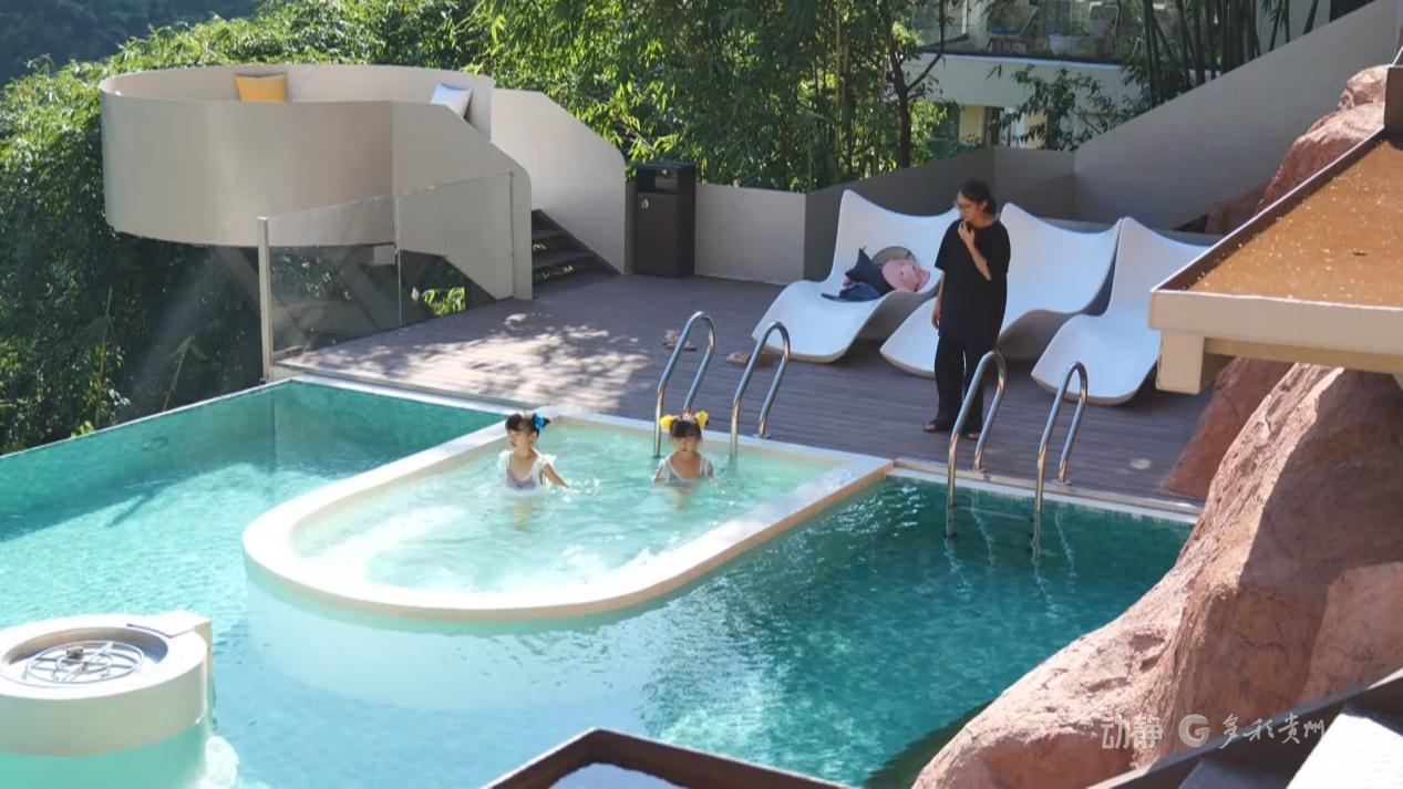 位于铜仁市万山区的朱砂古镇也迎来众多亲子客人,建在200米悬崖之上的酒店和无边泳池,以壮阔视野成为打卡热门地。泳池还专门开辟儿童区域,加上露营、烧烤等业态,让大人和孩子在这里都能找到属于自己的乐趣。