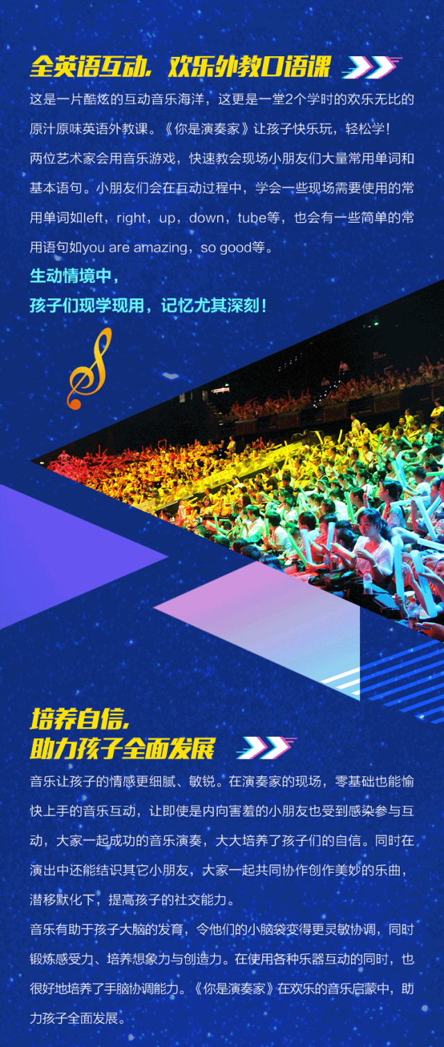 本演出由风靡国内外的著名制作人、海外优秀导演团队、高科技的视频设计和强大的演出阵容,让《你是演奏家2·超级金贝鼓》具备令人惊讶的强大舞台展现力。打破台上演台下看的传统模式,全场配合有趣的互动,一起跟随动感的节奏,一起成为“演奏家”!