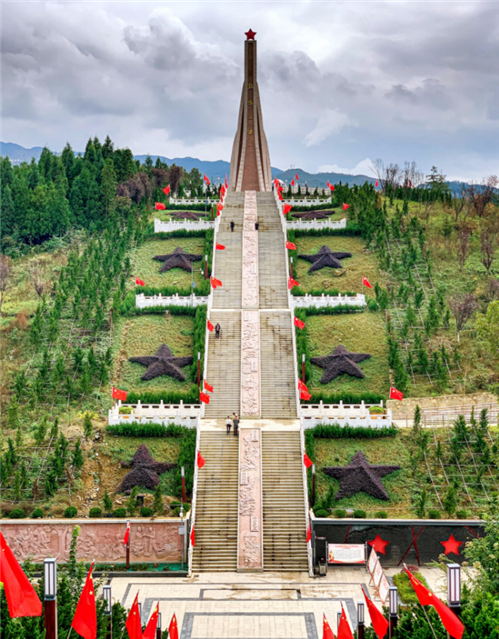 通往纪念阶梯中间的浮雕是红军长征的主要历史节点,即瑞金出发、血战湘江、强度乌江、遵义会议、土城战役、鸡鸣三省会议、四渡赤水、飞夺泸定桥等。阶梯有205阶,代表红军25000里长征、代表1935年2月5日鸡鸣三省会议召开时间和红军长征历时2年零5天3个寓意。
