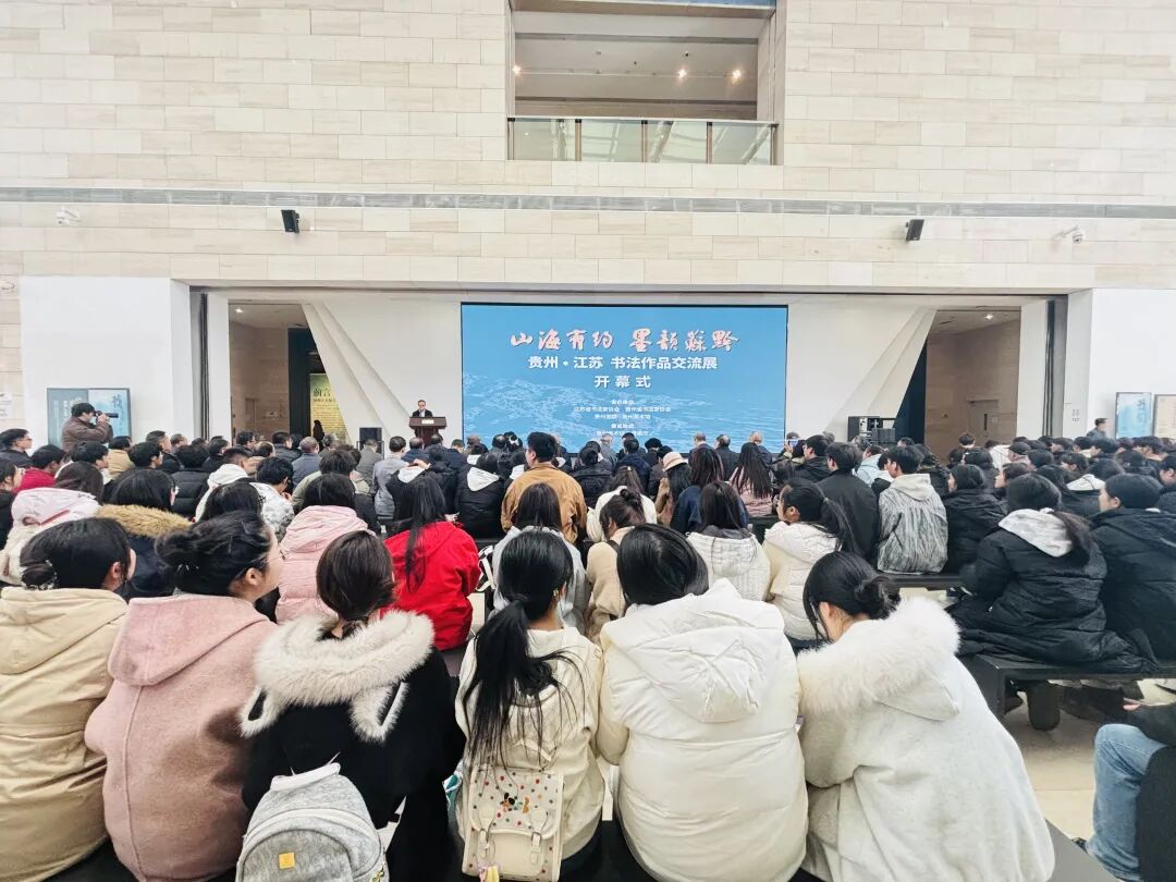 11月28日下午,由贵州省书法家协会、江苏省书法家协会、贵州画院(贵州美术馆)联合主办的“山海有约 墨韵苏黔”贵州·江苏书法作品交流展在贵州美术馆隆重开幕。贵州省文联党组成员、副主席朱宏出席开幕式并宣布展览开幕,中国书协理事、江苏省政府参事、江苏书协副主席刘灿铭作讲话,贵州画院(贵州美术馆)党总支书记陈顺祥致辞;两省参展书法家代表祝培良、徐晓军作发言,刘灿铭、王世鹏向贵州美术馆捐赠作品。江苏书法家代表及贵州书协部分老书家、主席团成员、理事、专委会负责同志、高校书法专业师生及全省书法爱好者300余人参加开幕式。开幕式由贵州省书法家协会秘书长刘宗阳主持。