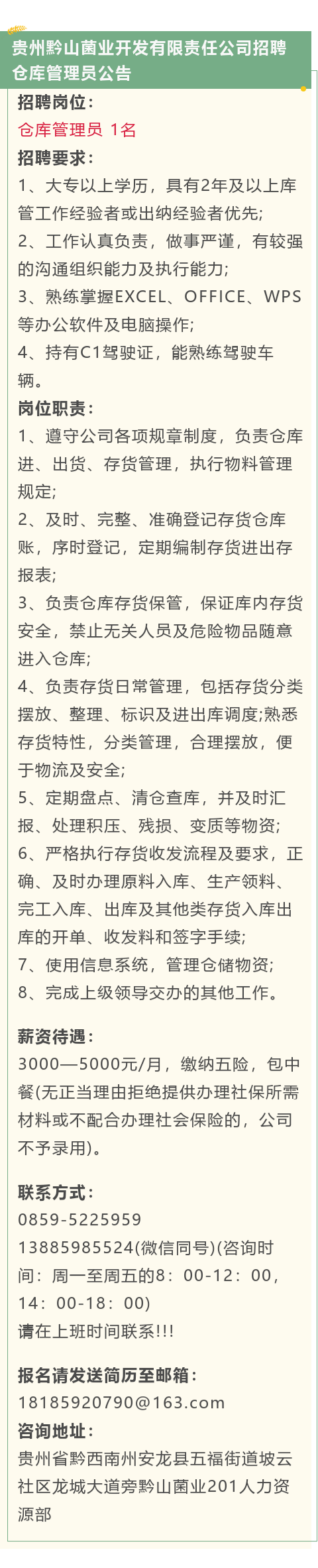 月薪3000—5000元,包中餐!贵州黔山菌业开发有限责任公司招聘仓库管理员!
