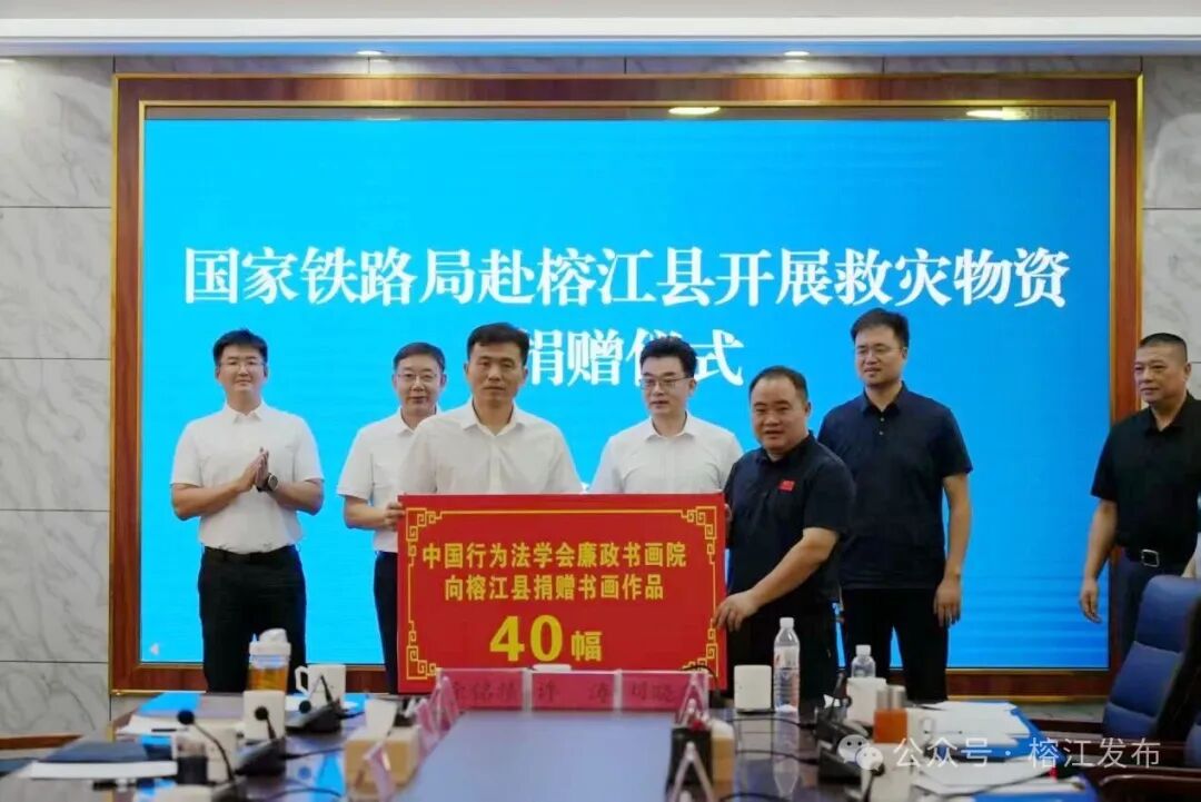 9月7日,国家铁路局赴榕江县开展灾后重建物资捐赠仪式。中国行为法学会廉政书画院向榕江县捐赠的40余件书画作品,并协助国家铁路局动员爱心企业捐赠价值860.9万元的援建物资,用于支持榕江灾后重建和“村超”文体事业发展。