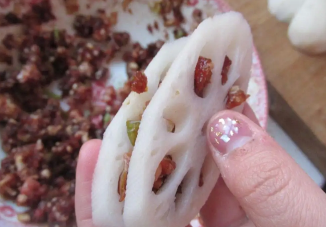 3.把肉末放在2片藕中间,盖住肉,放在盘子里。