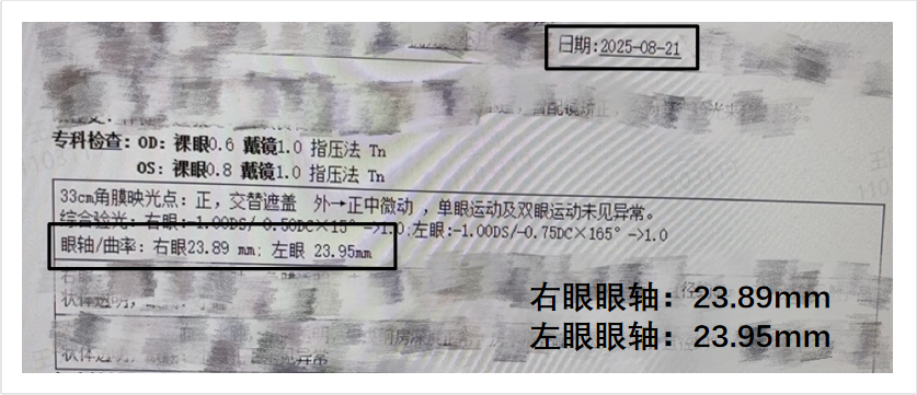 后续的“医管”随访体系持续为视力健康护航:从佩戴初期到定期复查,医院全程跟踪小诺的佩戴适应情况及眼部健康变化。2025年8月复查数据显示,小诺右眼眼轴降至23.89mm(回退0.2mm),左眼降至23.95mm(回退0.15mm),双眼裸眼视力分别提升至0.6和0.8,戴镜视力均达到1.0。