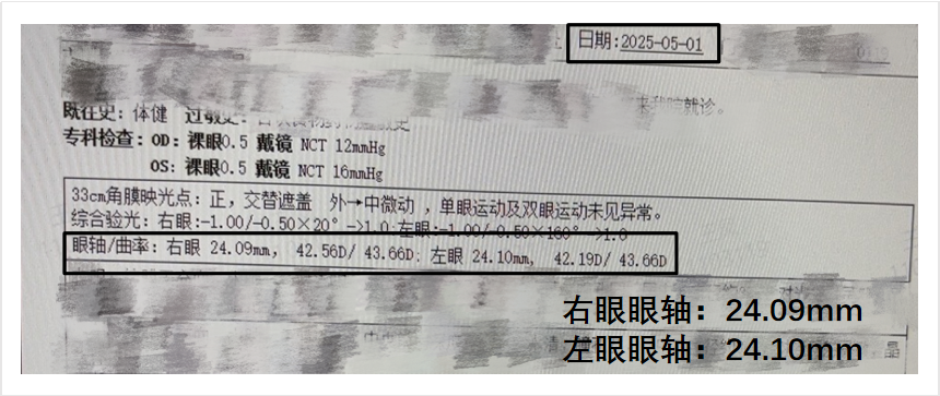 2025年5月1日,9岁的小诺(化名)因视力问题前来就诊。初诊时,医院通过“医检”体系对他进行了全维度眼部评估:专业设备测得其右眼眼轴24.09mm、左眼眼轴24.10mm(远超9岁儿童正常范围)并发现小诺存在轻微外隐斜,双眼裸眼视力均为0.5。医生指出,若不及时干预,不仅近视可能快速加深,还面临高度近视及视网膜脱离、黄斑病变等并发症风险。完整的“医检”数据为后续个性化方案的制定奠定了坚实基础。
