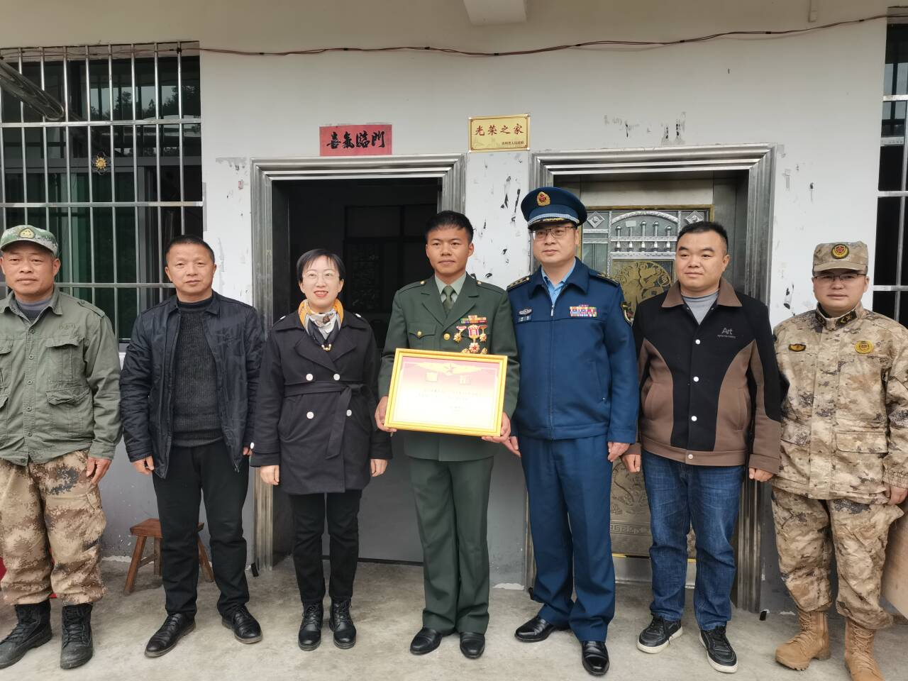 到达军属家中时,工作人员为军属贴上“光荣之家”对联,并将三等功喜报递到现役军人吴兴渊手中。