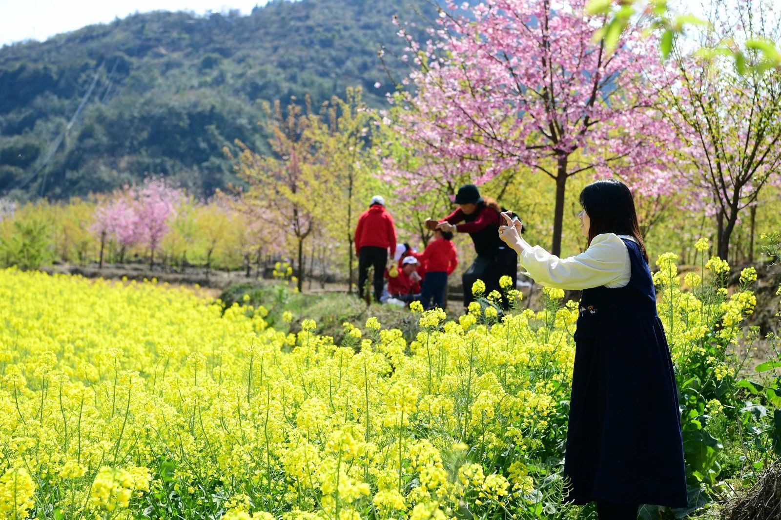 在樱花林中的油菜花田,金黄当前景,樱粉作背景,游人在其中漫赏风景