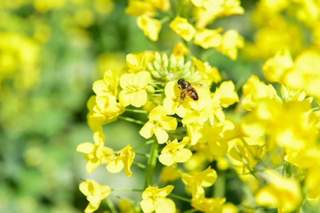 蜜蜂忙于花朵间,采集春天的馈赠