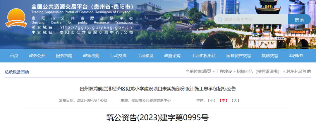 近日,贵阳市公共资源交易中心发布了贵州双龙航空港经济区见龙小学建设项目未实施部分设计施工总承包招标公告。