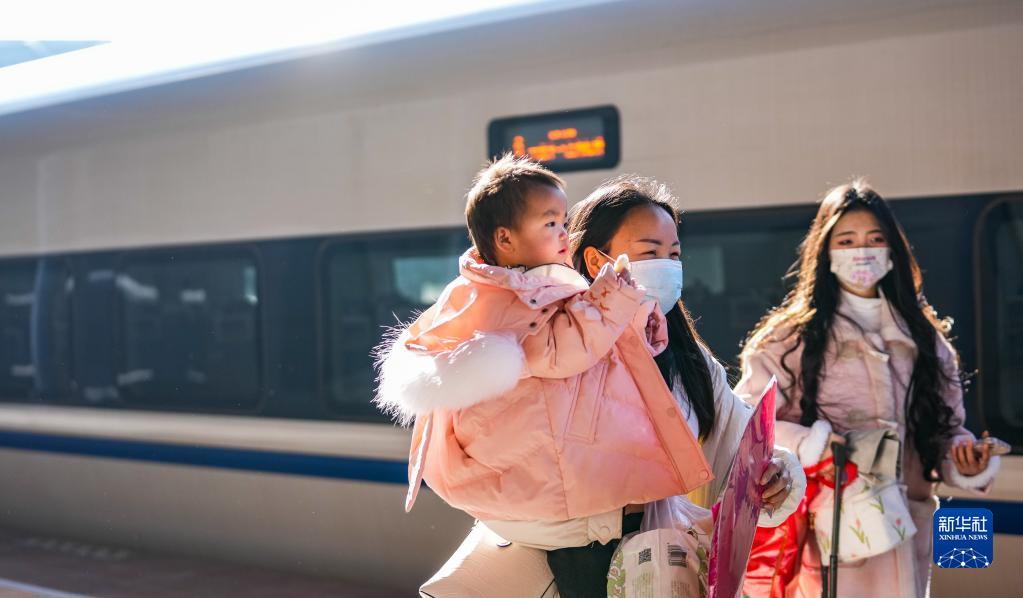 1月7日,在贵州六盘水站,小朋友和家人准备乘车。新华社记者 陶亮 摄