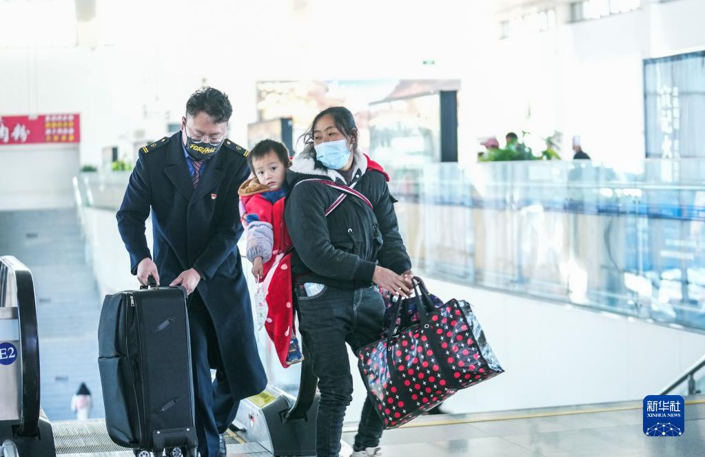 1月7日,车站工作人员在帮助带孩子的旅客搬运行李。新华社记者 陶亮 摄