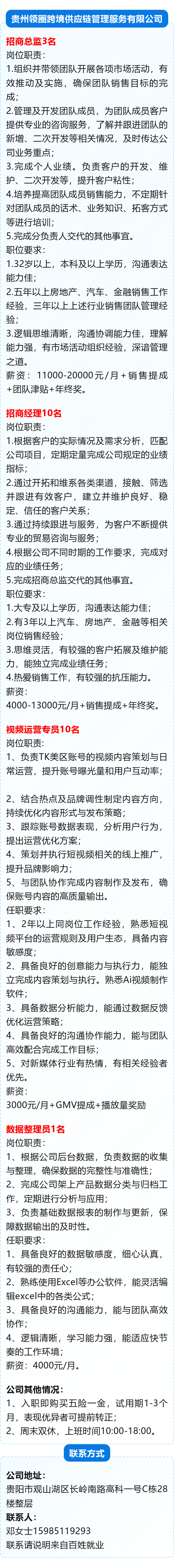 贵阳市观山湖区招聘!月薪可达20000元!五险一金!