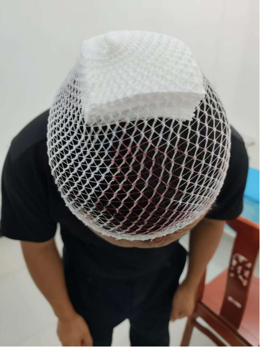 他的头被包扎了起来