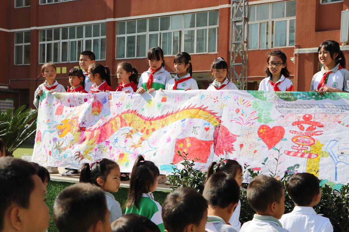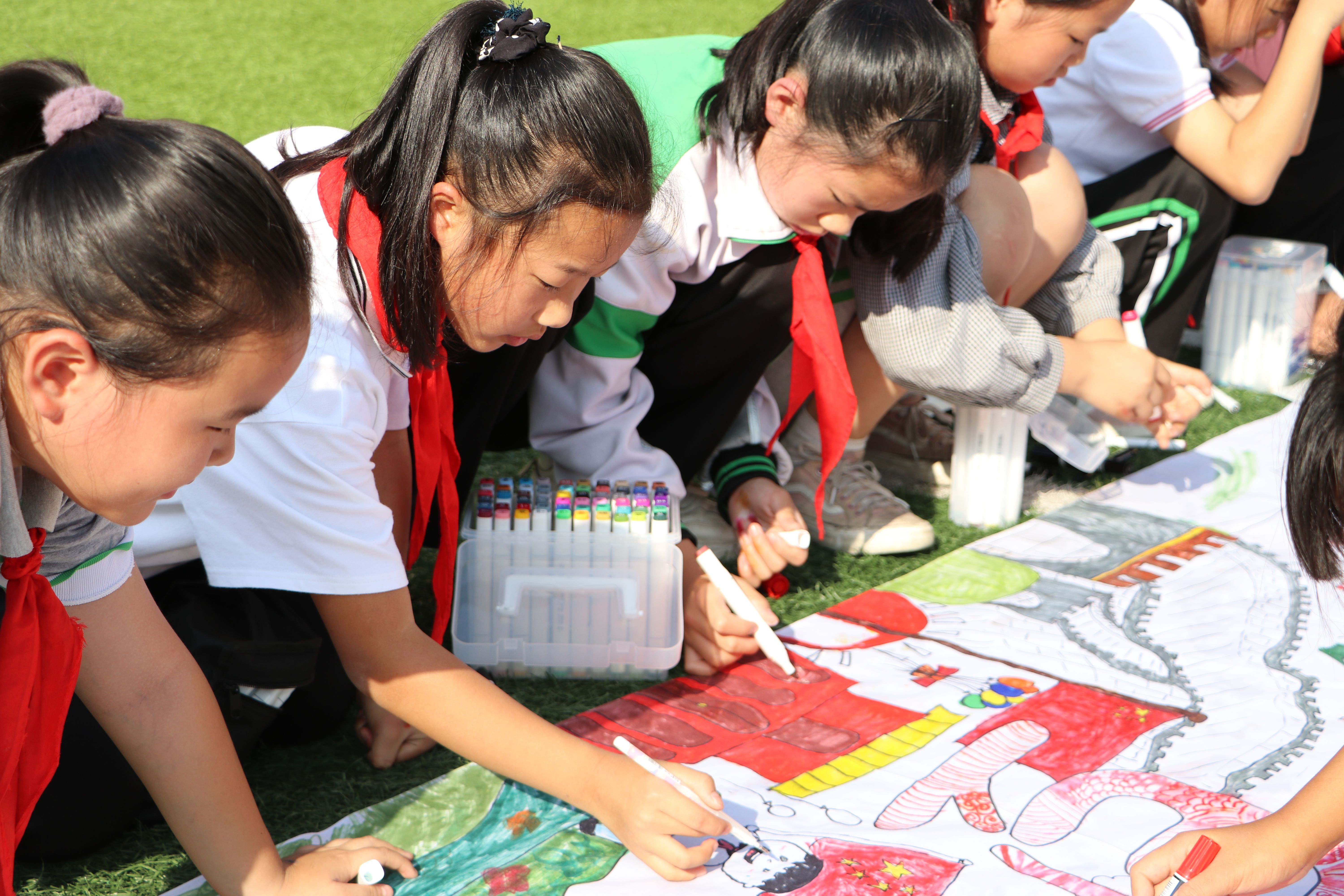 在少先队大队部辅导员郭英老师作了简短的发言之后,由3~6年级各班推荐一名组成的55名同学,看着眼前展开的洁白的画卷,摩拳擦掌,只待刘进燕老师发令“开始作画”,他们便一展身手。