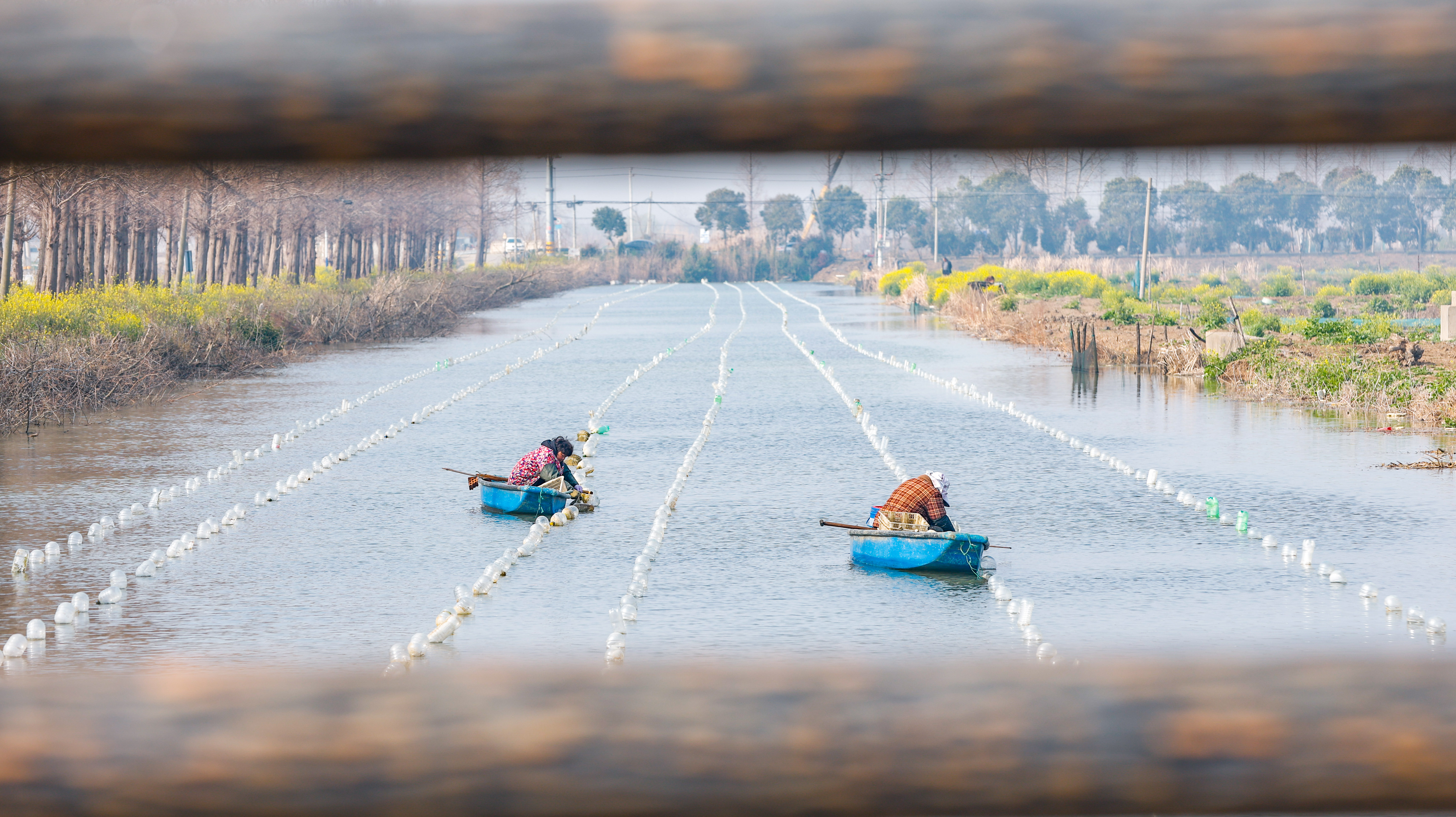 3月14日,蚌农在泗洪县临淮镇一内河水面投放珍珠蚌。 初春时节,在江苏省宿迁市泗洪县的多处河道和水库中,蚌农们忙着种蚌并投放养殖。地处洪泽湖畔的泗洪县水网密布,水资源丰富,该县利用资源优势,通过“合作社+农户”方式养殖珍珠蚌,全县养殖面积逾万亩。 新华社发(许昌亮 摄)