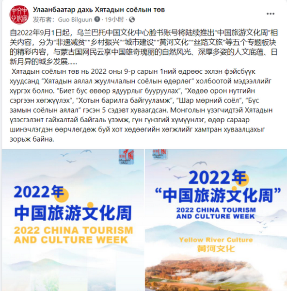 2022年“中国旅游文化周”活动全球启动仪式将于9月6日在北京举行。自2022年9月1日起,乌兰巴托中国文化中心脸书账号已陆续推出“中国旅游文化周”相关内容,分为“非遗减贫”“乡村振兴”“城市建设”“黄河文化”“丝路文旅”五个专题板块,旨在与蒙古国网民云享中国雄奇瑰丽的自然风光、深厚多姿的人文底蕴、日新月异的城乡发展。内容一经发布,就受到了蒙古国网民的高度关注和积极评价,点击量、跟帖量不断刷新。