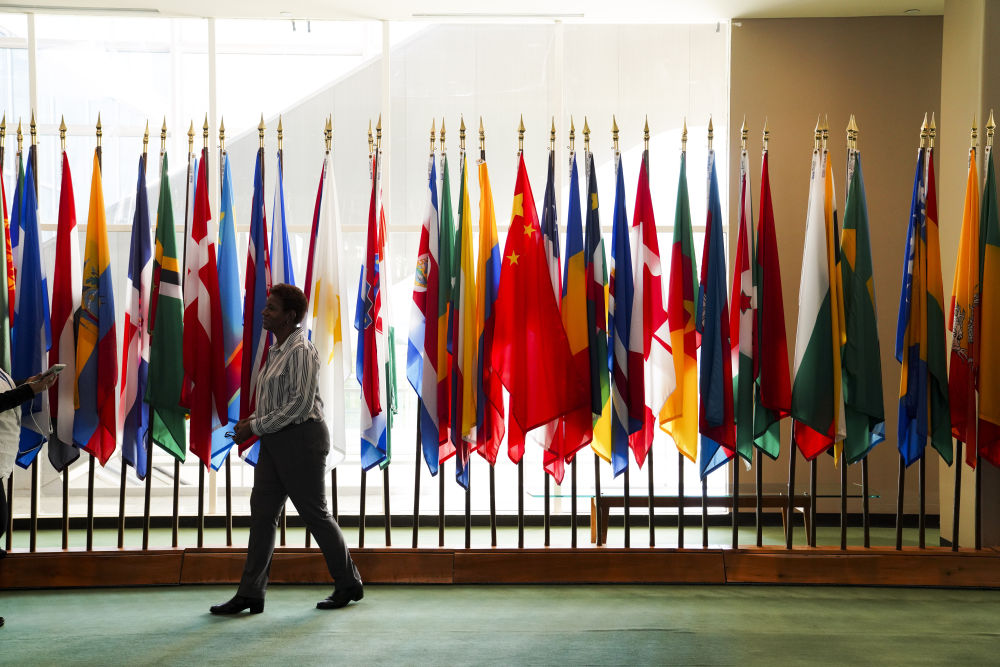 2021年10月20日,一名女子从纽约联合国总部联大会堂外的国旗展示区经过。新华社记者王迎摄