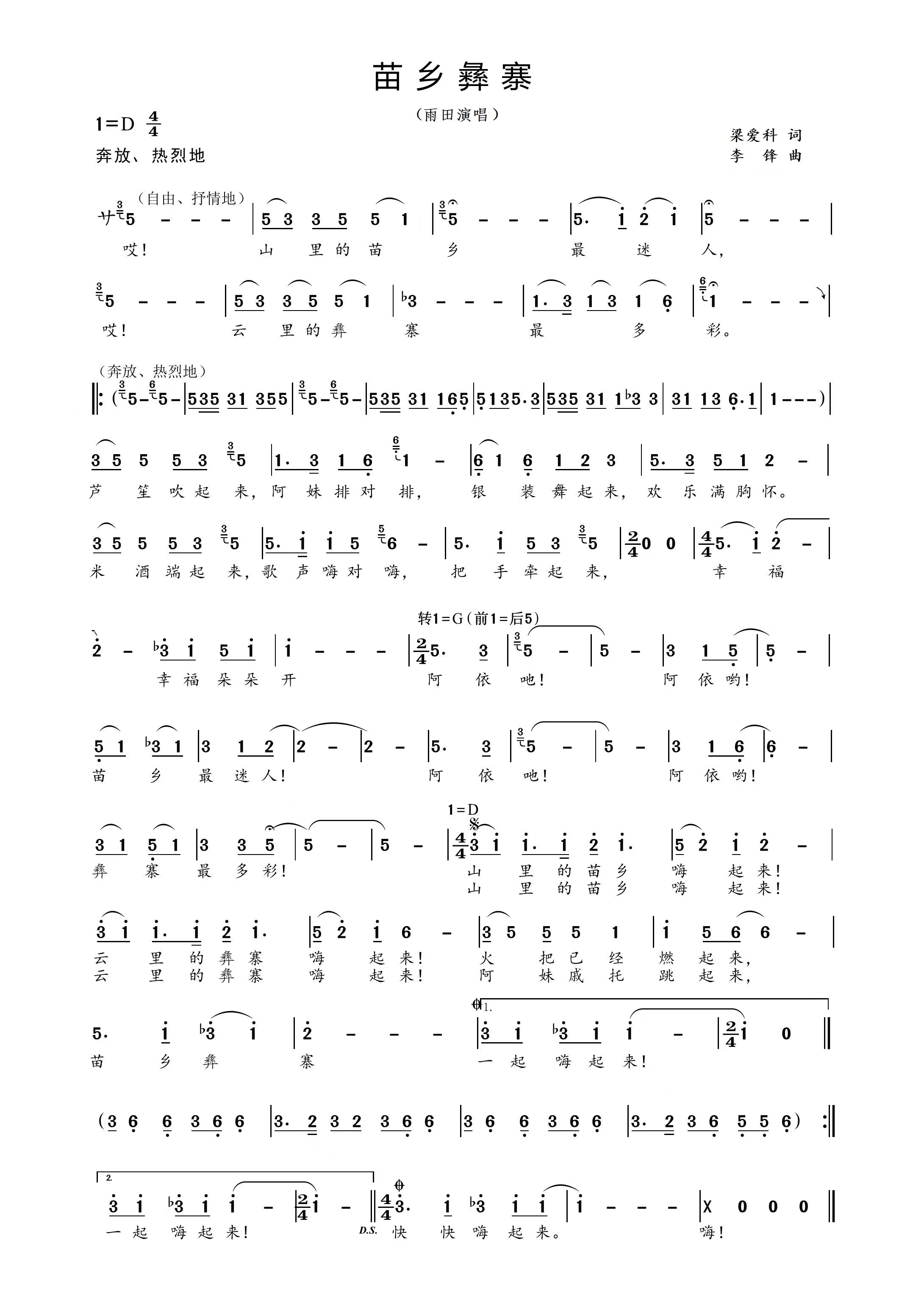 “山里的苗乡嗨起来,云里的彝寨嗨起来……”《苗乡彝寨》是由梁爱科作词,李锋作曲,雨田演唱的一首歌曲。该作品欢腾热烈,描绘了苗乡彝寨的人们载歌载舞的喜庆盛况,唱出了苗乡儿女喜迎四海宾朋的热情与豪情。