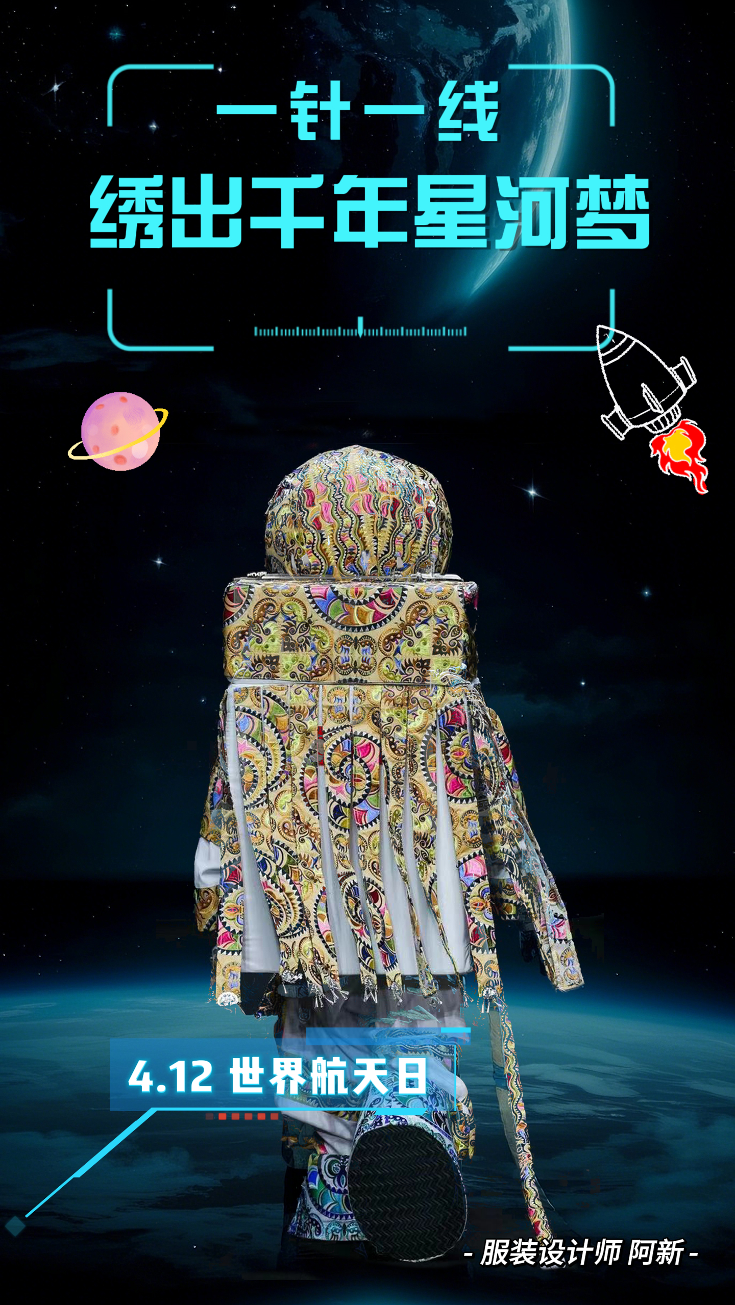 身着苗族百鸟衣的“太空人”仰望星空,古老的苗族刺绣与充满未来感的太空元素相互交织,传统与未来接轨,古老与科技碰撞,完美诠释了古阿新设计师的独特创意——希望有朝一日能将苗族刺绣绣向浩瀚苍穹。