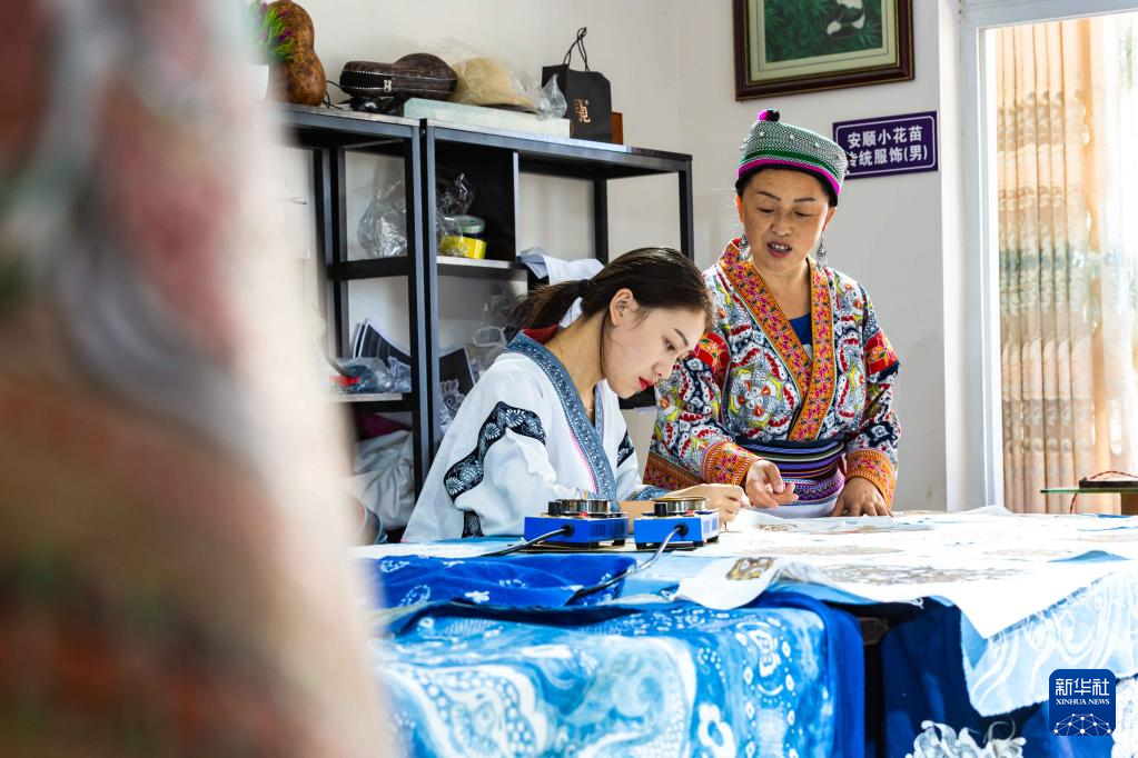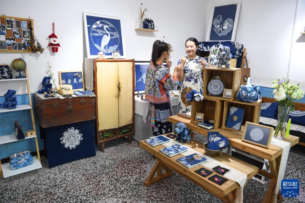 张娟娟(左)在蜡染体验工作室里给顾客介绍自己设计的蜡染文创产品(8月18日摄)/ 新华社记者 杨文斌 摄
