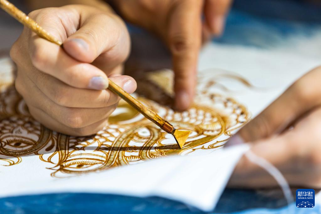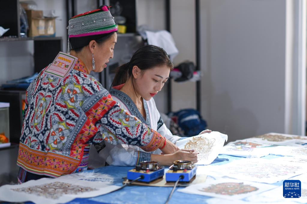 8月18日,张娟娟的母亲在蜡染工作室指导张娟娟绘制蜡版画 / 新华社记者 陈熙 摄