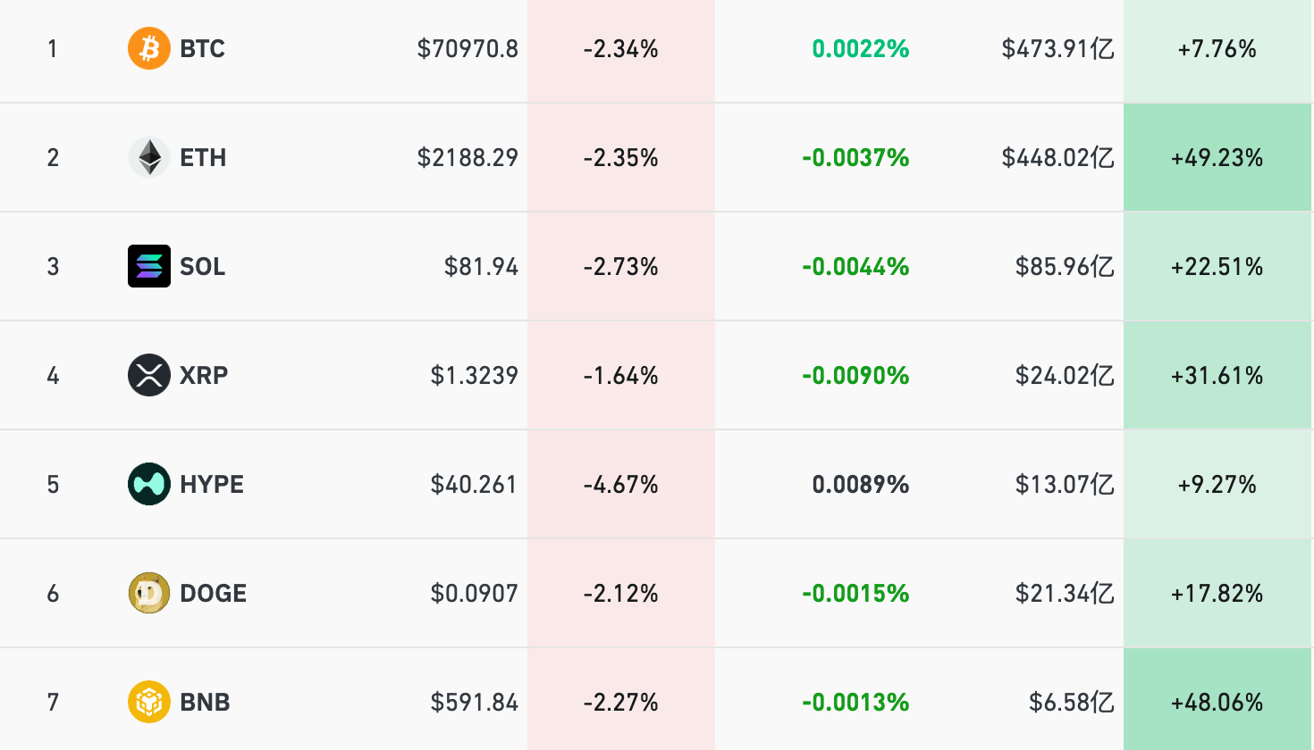 4月12日,加密货币集体大跌,晚间进一步跳水,截至12日晚11点,比特币跌超2.3%,报70970美元/枚,以太坊、SOL、狗狗币等同步下跌。