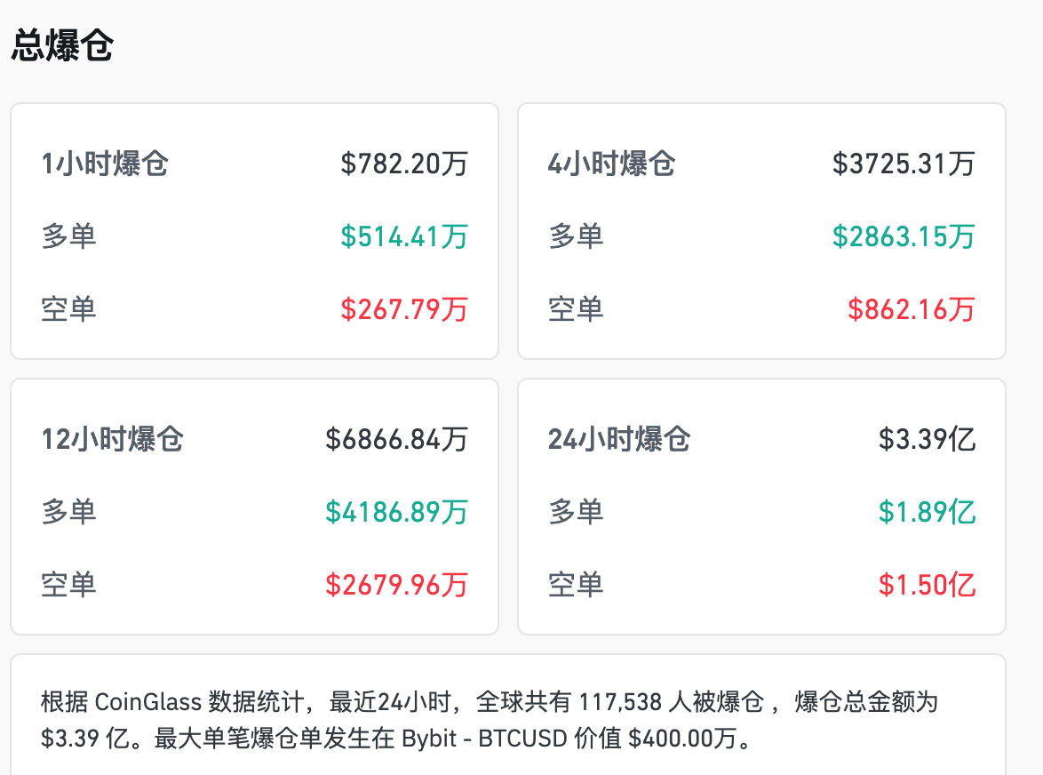 截至12日晚11时,最近24小时内,全球共有117538人被爆仓。