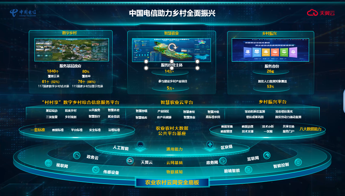 近年来,中国电信坚决贯彻落实乡村振兴战略,不断发挥自身优势,重点围绕农业农村信息化建设需求,综合运用5G、云计算、大数据、物联网、区块链、人工智能等数字技术手段,构建乡村数字化、网络化、智能化信息服务体系,实现县乡村三级联动管理、资源整合、公共服务融汇通畅,提高政府办事效率和服务能力,全面提升乡村数字化治理能力。