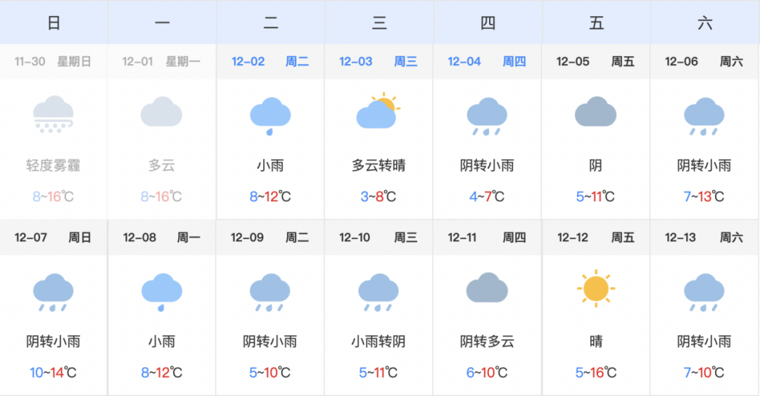 根据气象部门发布的天气预报,12月5日(周五)为阴天,而12月6日-7日贵阳市连续两天降雨,气温在5-14℃之间,降雨天气,车辆减速慢行,如遇降雨,车辆缓行,预计会有交通拥堵情况发生。