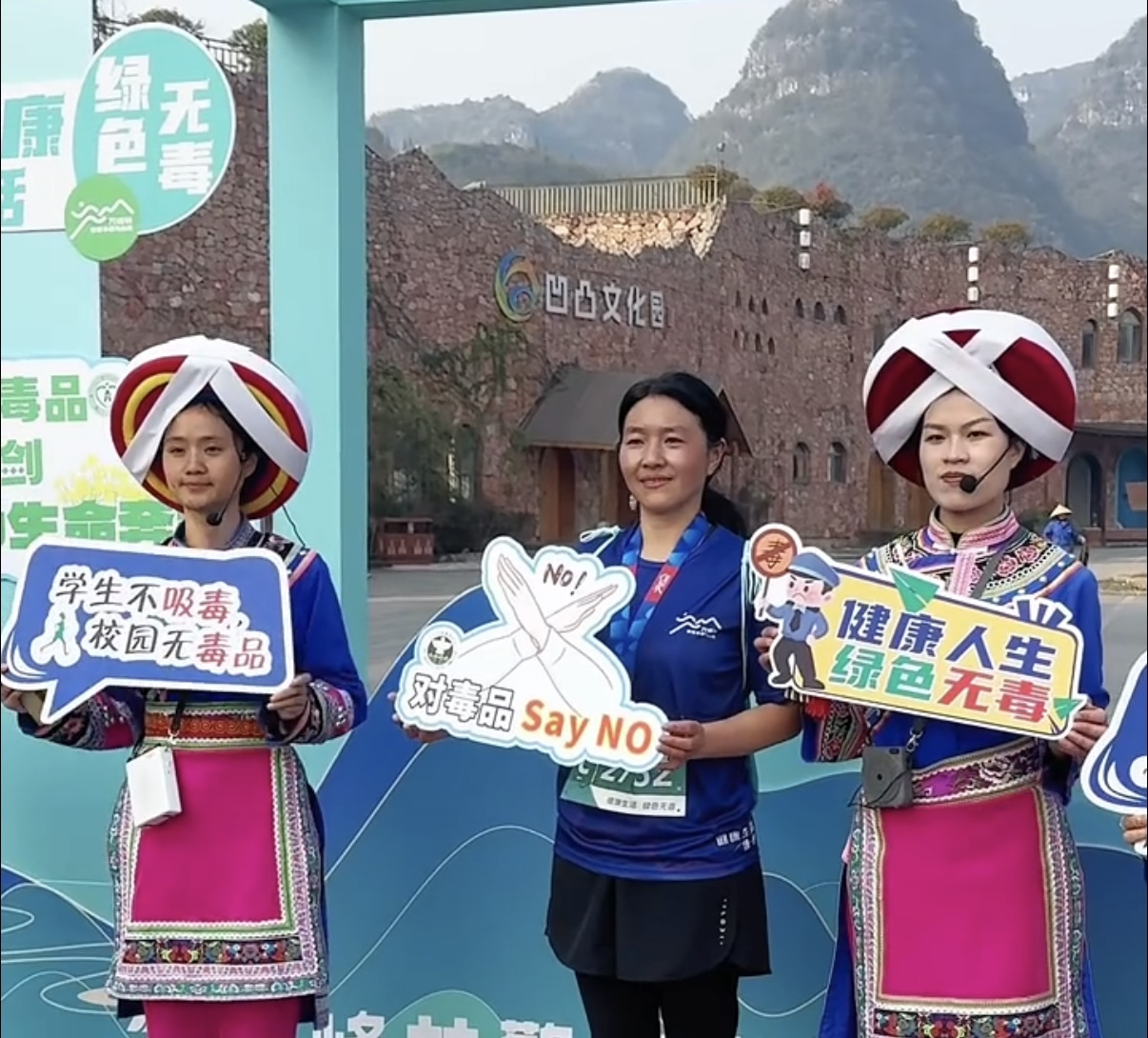 在2025万峰林警察半程马拉松健康跑终点的万峰林西南广场,民警采用快板、AI技术等方式,花式开展禁毒宣传。