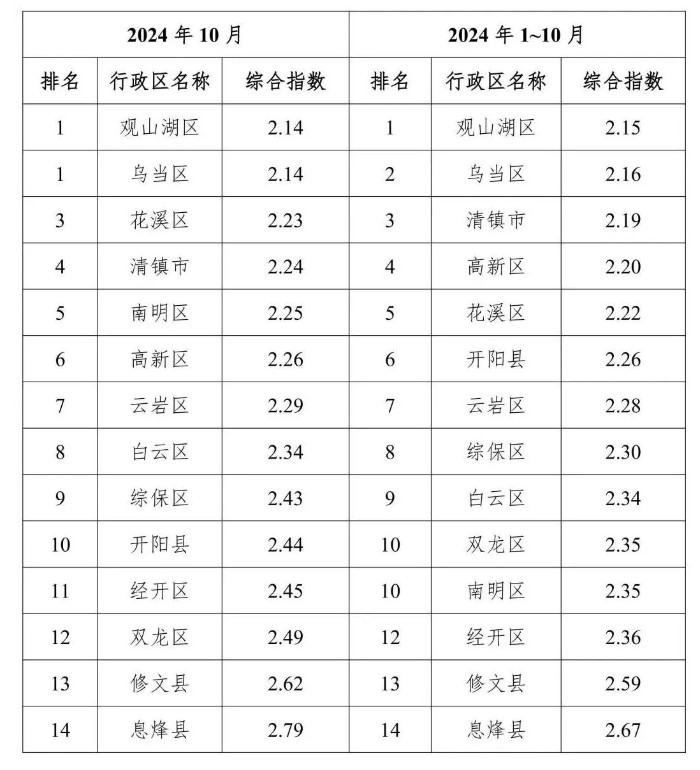11月11日,根据贵阳市生态环境局官方信息《环境空气质量标准》和《城市环境空气质量排名技术规定》获悉,2024年10月贵阳市各区(市、县、开发区)环境空气质量综合指数考核观山湖区、乌当区并列第一。