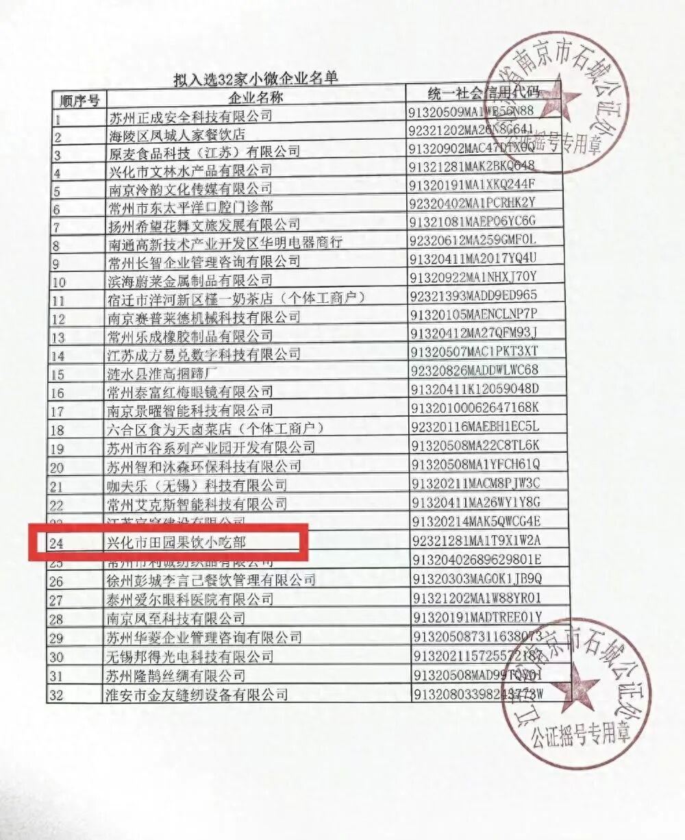 九派新闻注意到,拟入选的32家小微企业包括个体工商户涉及制造业、餐饮零售、文化产业等。九派新闻联系到了位于泰州兴化市的田园果饮小吃部负责人冯先生。他坦言,当朋友向他发来门店成功入选的新闻链接时,他的心情可谓惊讶,甚至一度怀疑是诈骗信息。