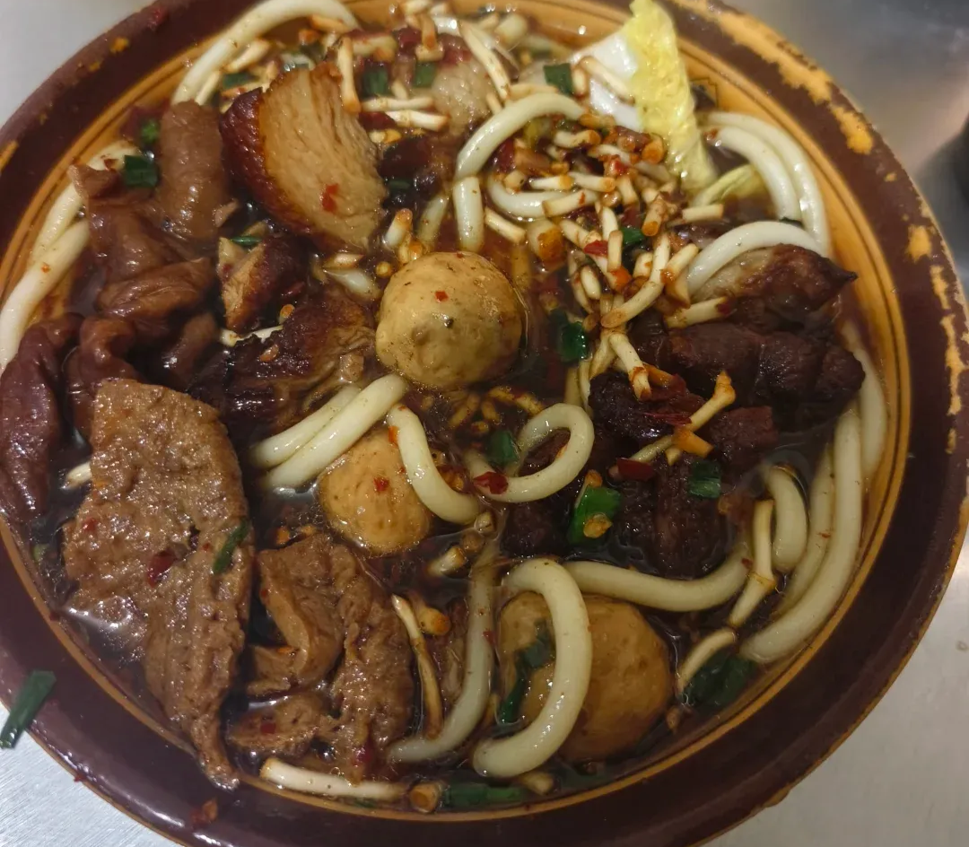 卤粉,是黔西美食里的集大成者。若是觉得单一口味的牛肉粉不够过瘾,那碗“应有尽有”的卤粉,便是最合心意的选择。卤汁的醇正,是这碗粉的灵魂所在。土豆、腐竹、魔芋吸足了浓郁卤香,软糯脱骨的鸡爪、鸡腿铺满碗面,满满当当盖在莹润的米粉上,光是看着就让人垂涎。但真正的行家都懂,最后淋上的那一勺灵魂折耳根辣椒水,才是让所有味道瞬间升华的关键。卤香的醇厚、辣椒的鲜辣,再碰撞上折耳根独有的山野清香,一口下去,只剩一个字:绝!而五小湾胖子卤粉店的这碗卤粉,正是将这份绝妙风味发挥到极致的存在,早已成为许多黔西人心中无可替代的味觉地标。