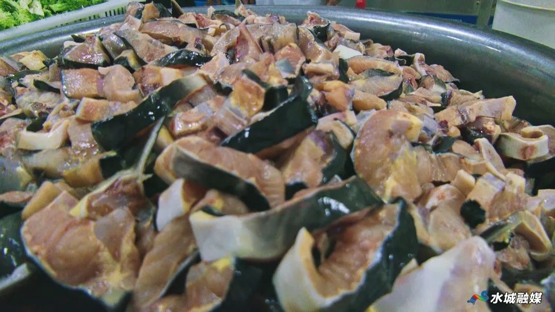 食堂内准备下锅的新鲜鱼肉。周仁富 摄