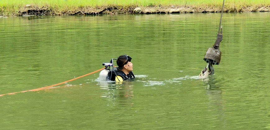 岑巩县消防救援大队潜水员根据确定的大致位置潜入塘中确定落水车辆位置,用吊车扁带拴在落水车辆指定位置制作锚点;并用吊车连接吊车扁带将落水车辆吊起进行转移,在现场指战员和交警同志的共同努力下,历经一个多小时团结协作,最终成功将落水车辆打捞上岸。
