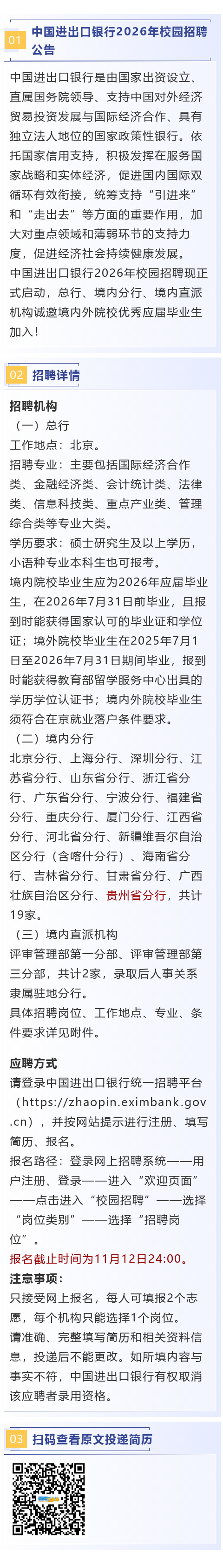 【国企】中国进出口银行贵州分行招聘!报名截止时间:11月12日!