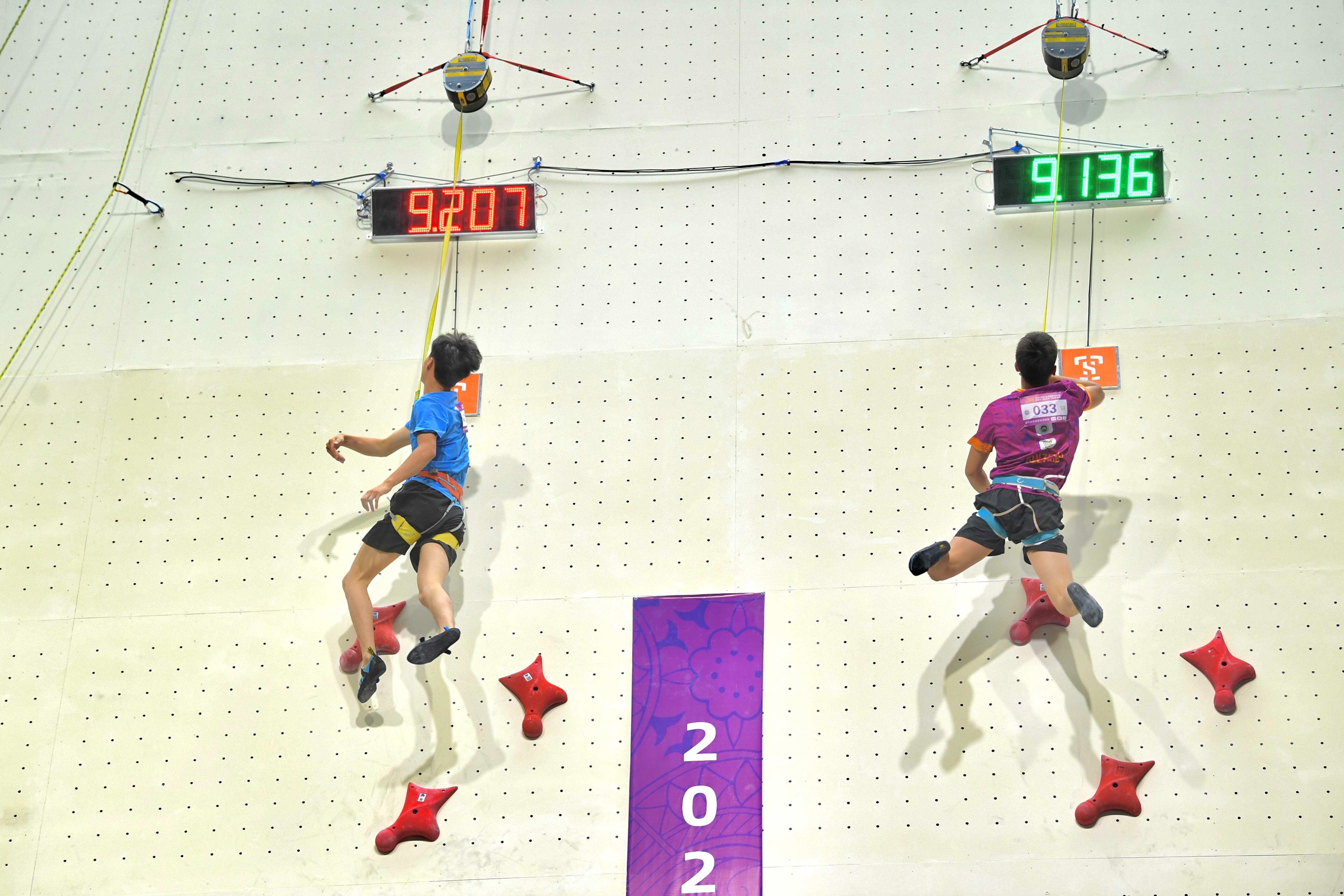 上午,公开组速度赛和青少年组两项全能(攀石)预赛同时开赛,攀岩馆内,选手们将智力、毅力和力量完美结合,在岩壁上不断攀爬,勇攀自己的高峰。