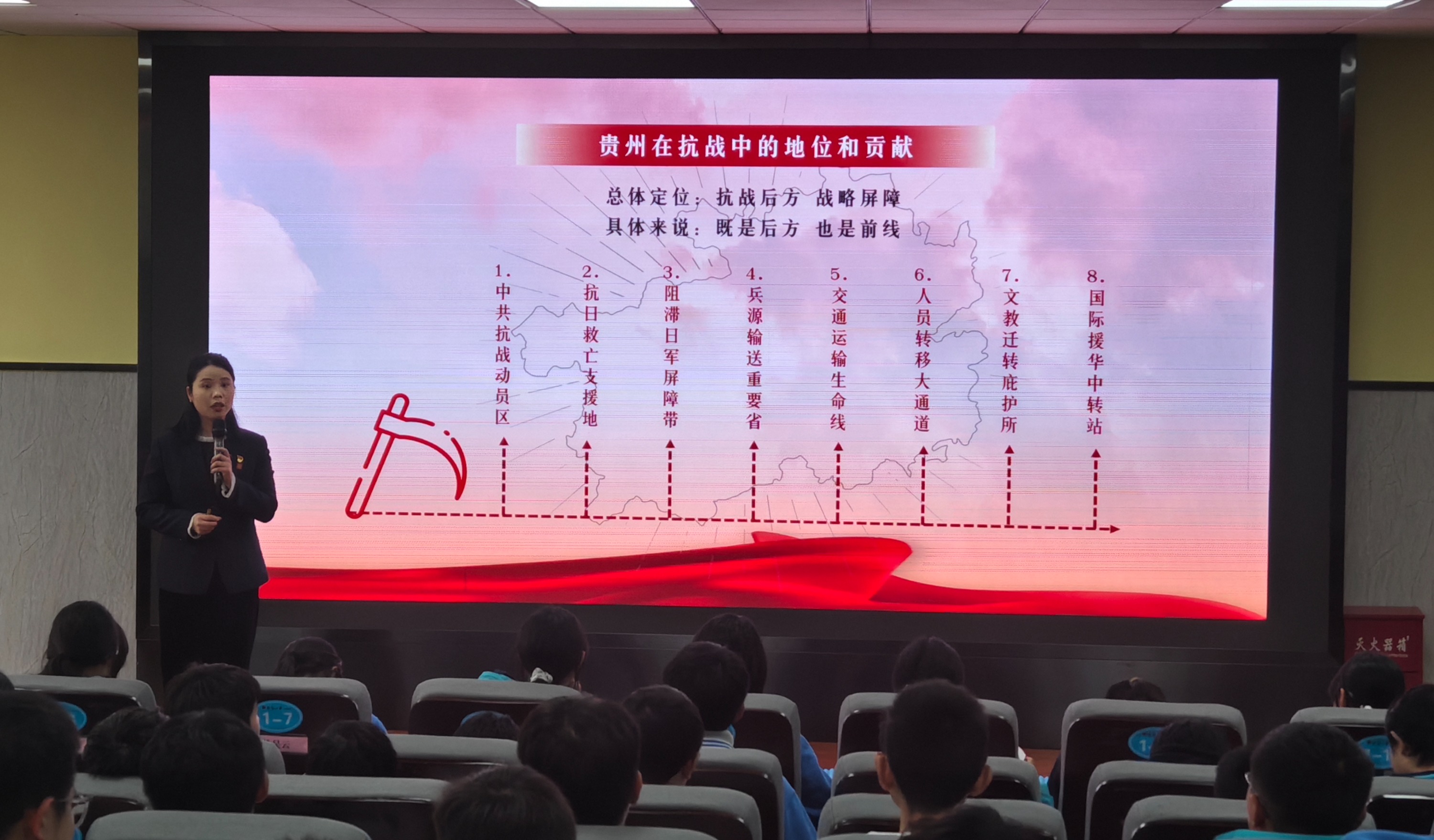 近日,贵州省博物馆的讲解员与志愿者走进北京八中贵阳分校,为初中学生带来一堂沉浸式“大思政课”。课程以“八十载烽火铭记 一体化思政铸魂”为主题,是纪念中国人民抗日战争暨世界反法西斯战争胜利80周年系列活动之一。课堂结合历史实物线索与互动式教学,让学生在具体情境中触摸贵州的历史。