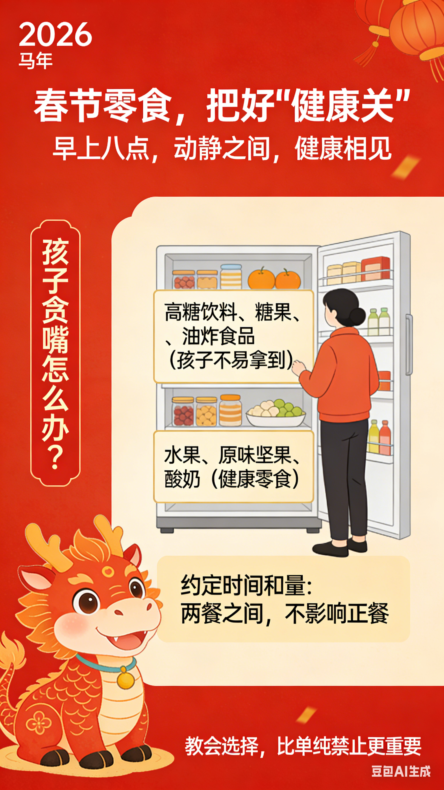 过年家里零食多,孩子难免贪嘴。建议家长做好“健康守门人”:把高糖饮料、糖果、油炸食品放在孩子不易拿到的地方;多准备一些水果、原味坚果、酸奶等健康零食。同时约定好吃零食的时间和量,比如在两餐之间,不影响正餐。教会孩子选择,比单纯禁止更重要。