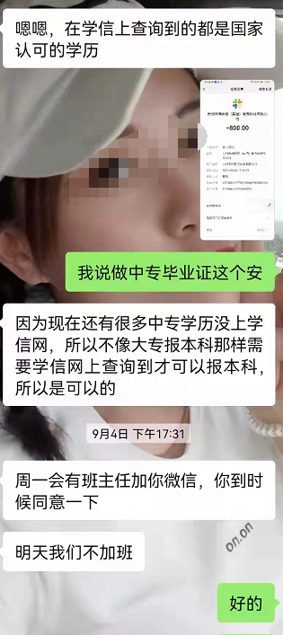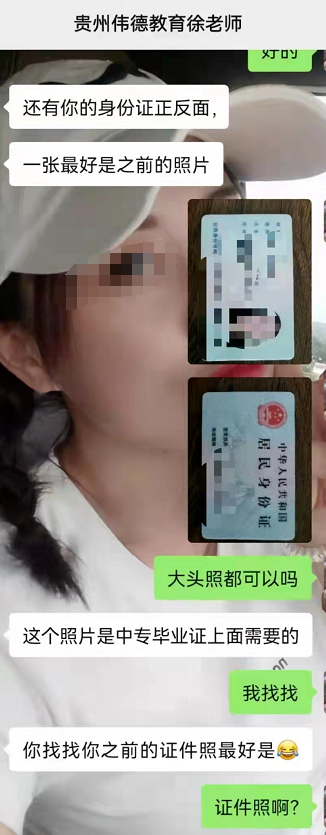 在与李女士的聊天过程当中,贵州伟德教育的徐某明确提到,现在还有很多中专学历没上学信网,他得先帮李女士办理一个中专毕业证。与此同时,徐某还要求李女士提供一张前几年的照片,并声称这张照片用于中专毕业证。