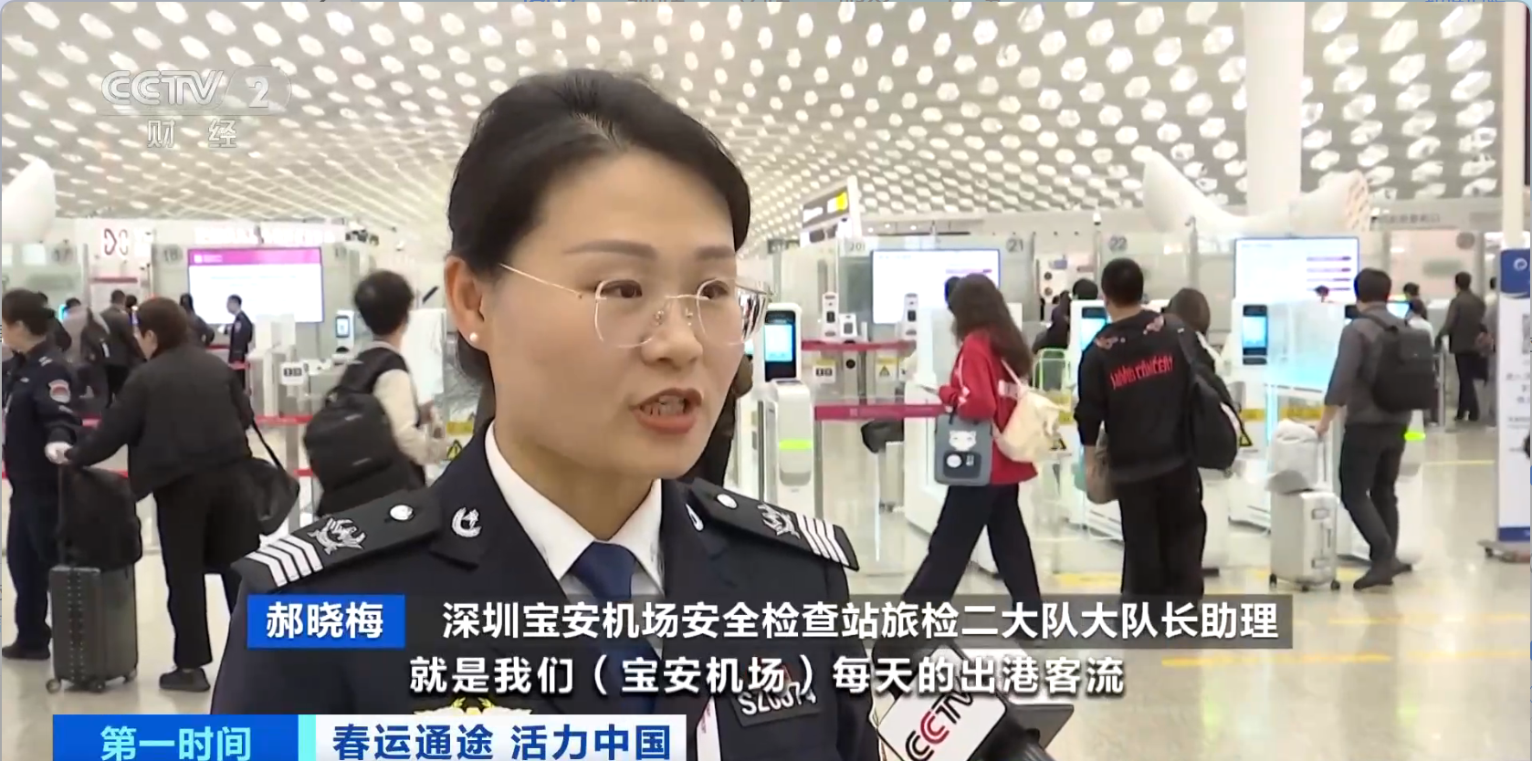 深圳宝安机场安全检查站旅检二大队大队长助理 郝晓梅:自春运以来,宝安机场每天的国内出港客流已经突破10万人次,“易安检”旅客每天有12000人次左右,目前“易安检”通道的通行效率是普通通道通行效率的1.5倍。