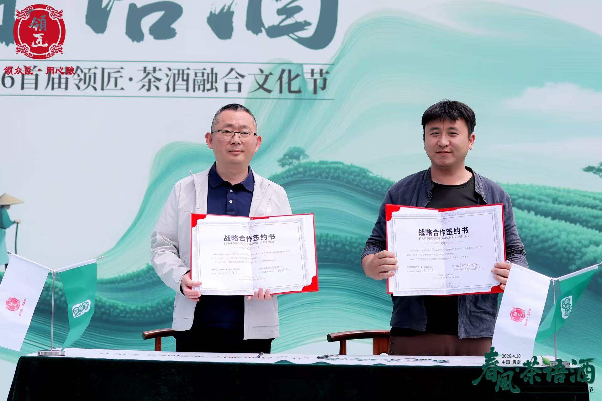 贵州领匠酒业与贵州御茶银茶业有限公司正式签署战略合作协议。双方将共同开发贵定云雾贡茶系列产品,共建茶酒融合体验空间,并持续联合举办年度文化节,以文化节为契机,推动云雾茶产业与白酒产业双向赋能,助力乡村振兴。
