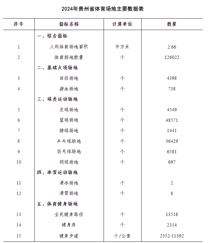 贵州省体育局根据《全国体育场地统计调查制度》(国统字〔2023〕131号),以2024年12月31日为标准时点,组织开展全省体育场地统计调查工作。现将主要情况公布如下。