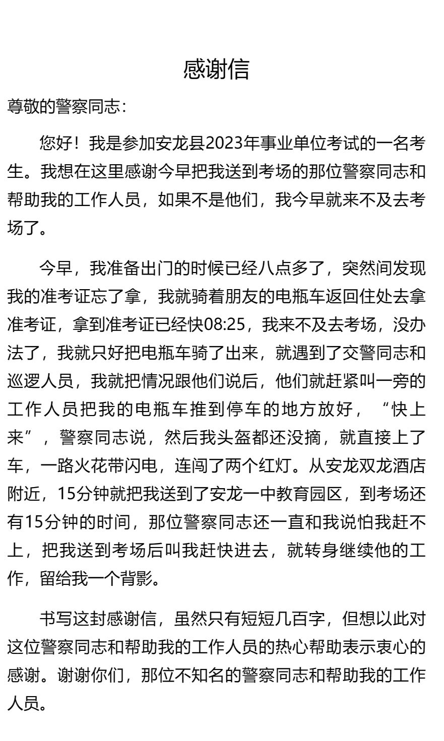 “书写这封感谢信,虽然只有短短几百字,但想以此对这位警察同志和帮助我的工作人员的热心帮助表示衷心的感谢。谢谢你们,那位不知名的警察同志和帮助我的工作人员。”
